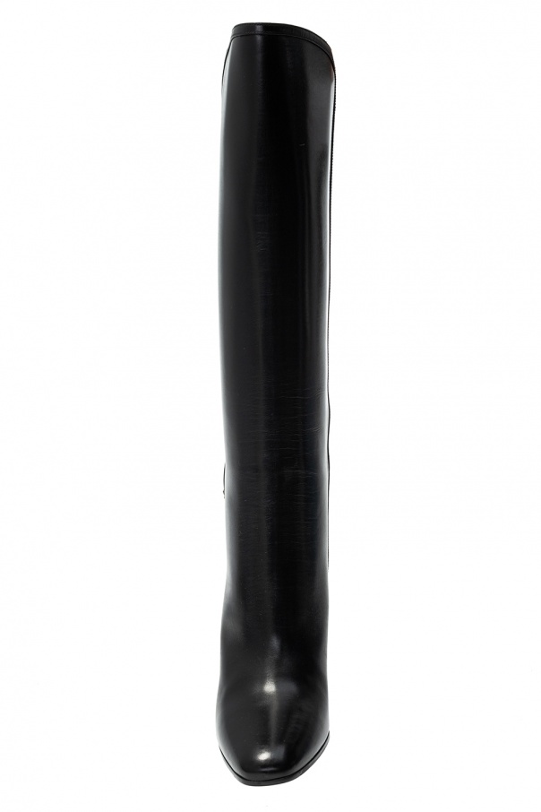 Black ‘Jane’ heeled boots from Saint Laurent. Crafted from calf leather, this slip-on model features a logo appliqué in antiqued gold-tone metal and a black leather sole.