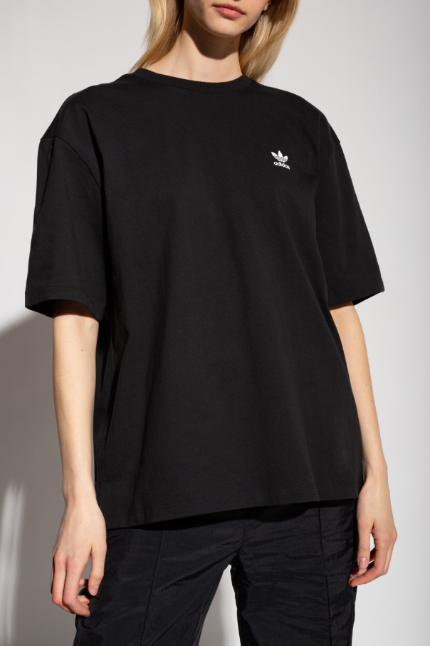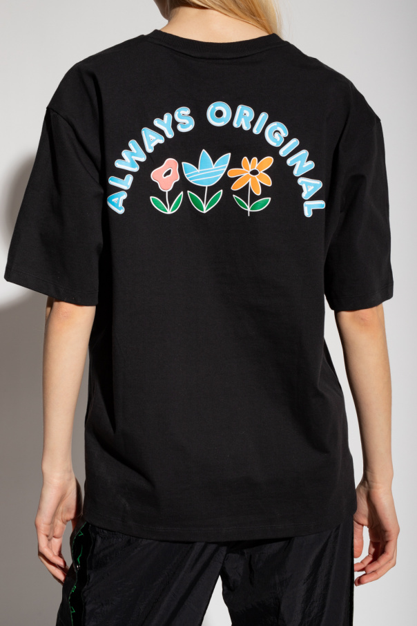 Black crewneck T-shirt from ADIDAS Originals. Made of cotton, this short sleeve design features a white logo print and multicolored logo print.