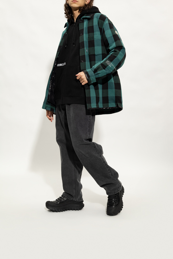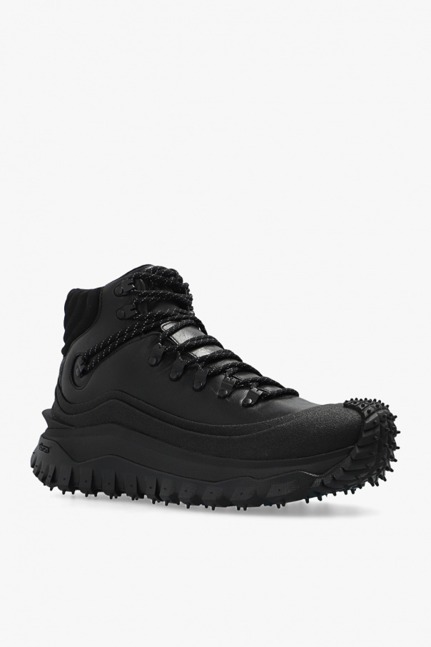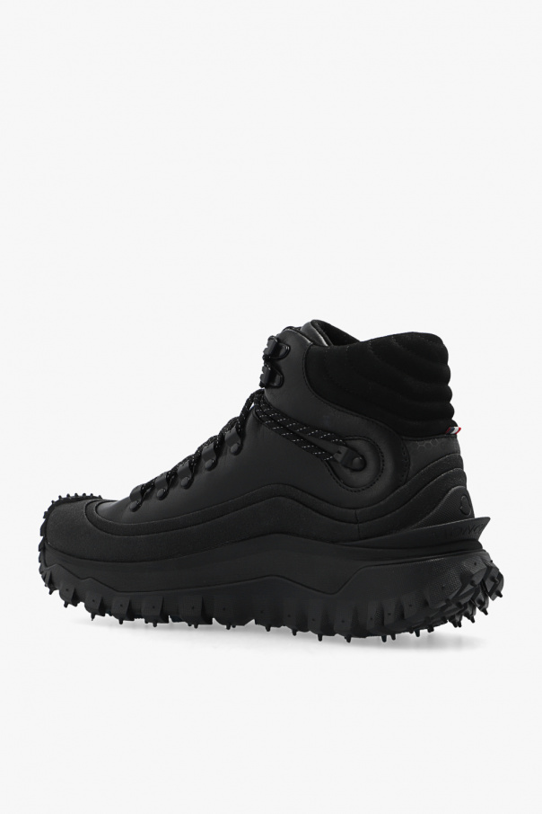 Black ‘Trailgrip GTX High’ high-top hiking boots from Moncler. Crafted from leather enhanced with a waterproof Gore-Tex membrane, this lace-up model features logo detailing, a reflective inserts and quilting at the back, EVA midsole, carbon fiber between mid-sole and tread, and a black and green Vibram® Megagrip rubber compound treaded sole.