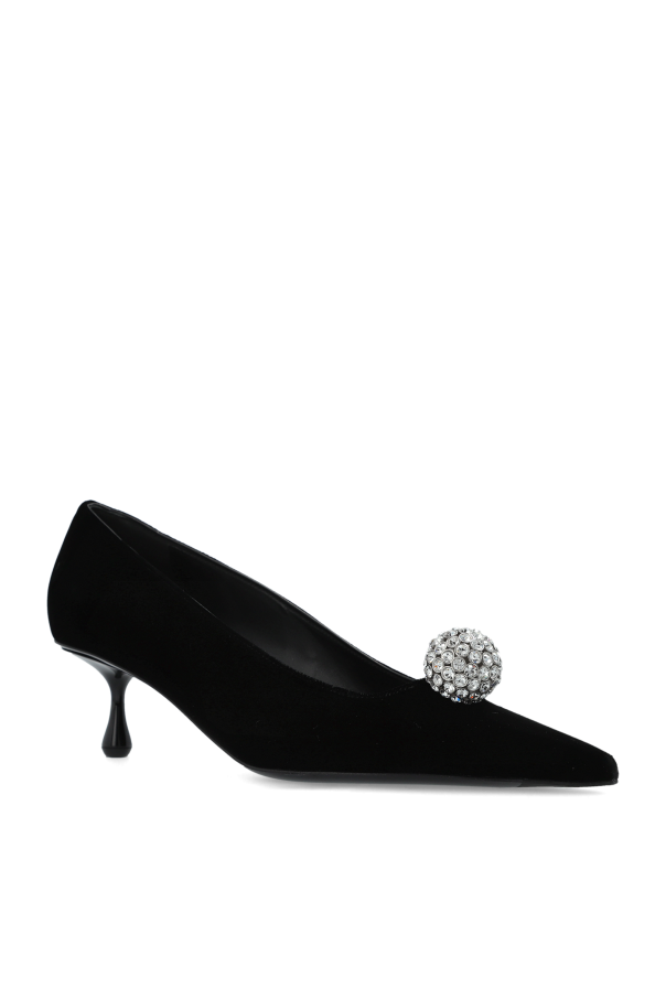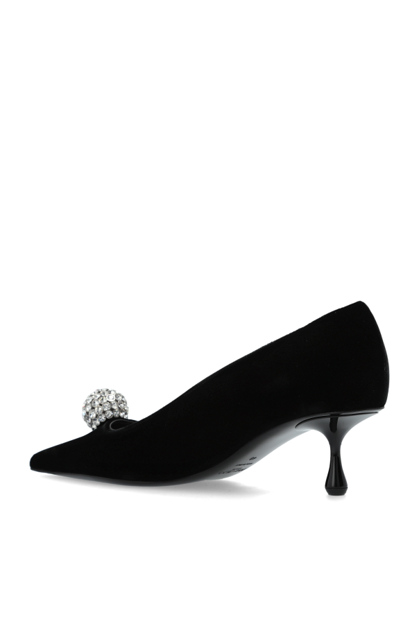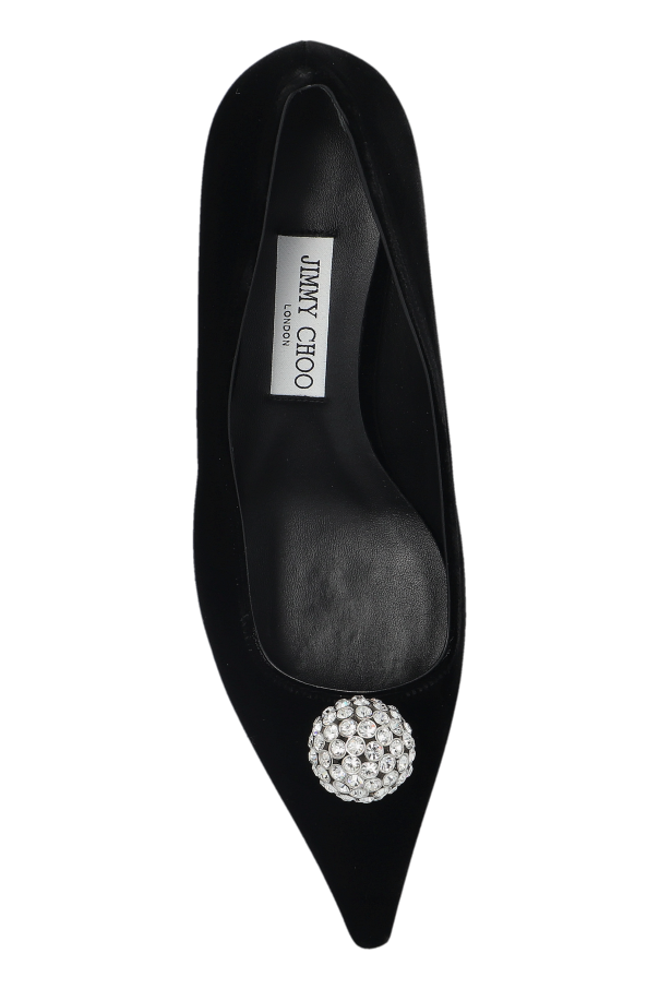 Introducing the 'Orb', an epitome of sophistication and luxury from the illustrious fashion house of Jimmy Choo. These elegant black heels boast a classic pointed toe and a refined kitten heel, embodying both grace and subtlety. Crafted from sumptuous black material, potentially velvet or another luxurious textile, they feature an opulent decorative sphere adorned with shimmering stones on the front, adding a striking accent to their timeless design. Inside, the insole of these exquisite shoes proudly displays the iconic Jimmy Choo logo, affirming their exclusivity and affiliation with a renowned brand. The outer layer is made of premium materials, complemented by a leather interior and a dual-material sole of gum and leather. Why Choose This Product? Exquisite craftsmanship and luxury materials. Distinctive, eye-catching design with sparkling embellishments. A timeless accessory for formal occasions. Signature style from the world-renowned Jimmy Choo.
