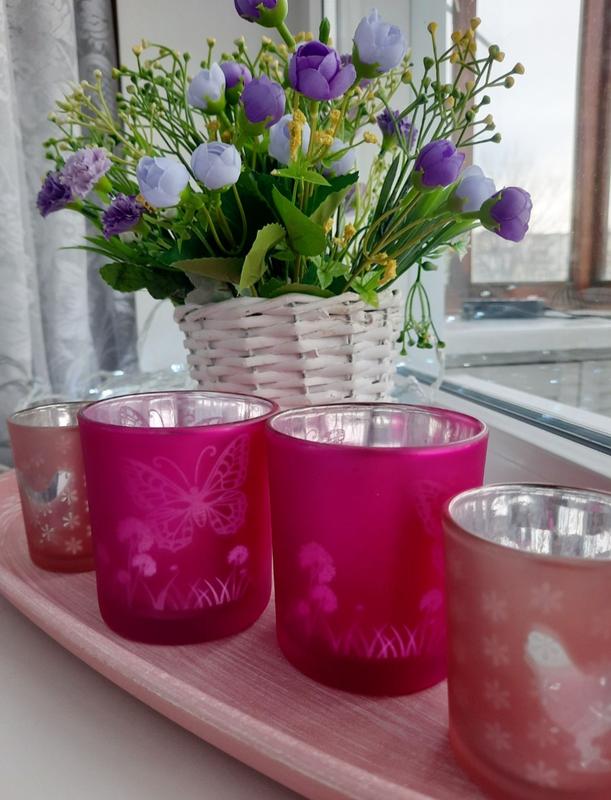 5,5×6.8 смНабор в нежно-розовых тонах, подсвечники с серебристым напылением внутри.