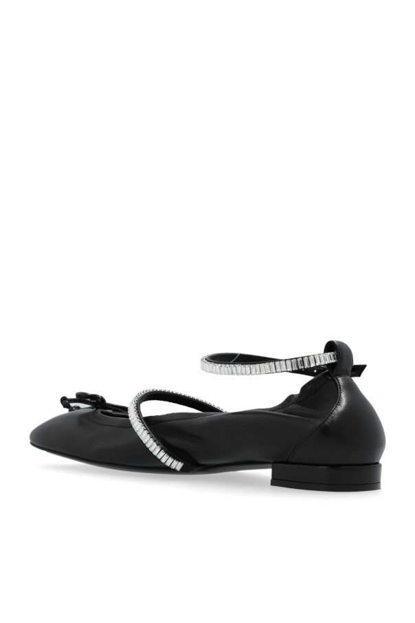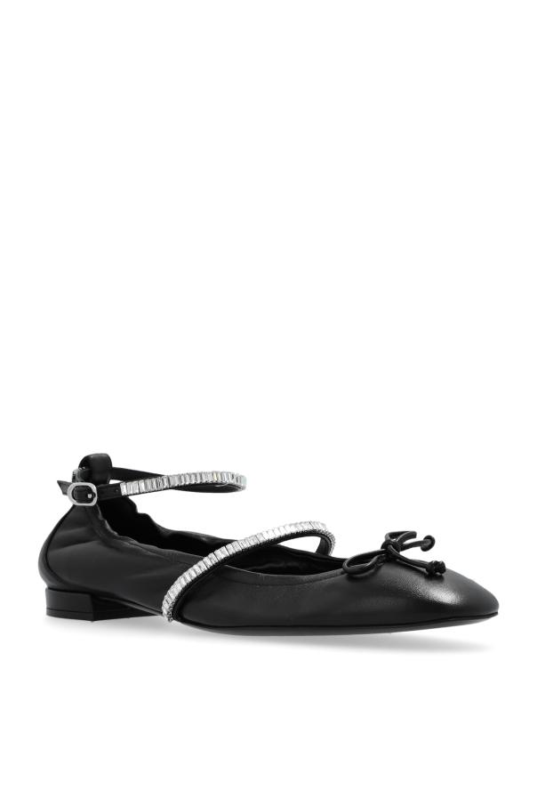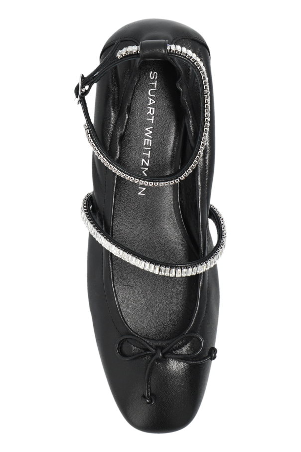 Introducing the Stuart Weitzman Stefanie Leather Flats, a quintessence of elegance and comfort. These exquisite black ballet flats are meticulously crafted from premium, smooth, and glossy leather, reflecting the high-quality one expects from a renowned designer like Stuart Weitzman. The Stefanie flats are characterized by their sleek black hue, embodying timeless sophistication. The design features a secure and elegant strap that crosses the top of the foot, ending in a side buckle, complemented by a dazzling silver ring that adds a distinctive touch of class, setting them apart from conventional ballet flats. The rounded toe is adorned with a delicate bow, enhancing the feminine allure of this exquisite pair. Inside, the designer's signature inscribed adds an exclusive mark of authenticity. Whether showcased alone or paired with casual blue jeans, these flats offer a glimpse into how they seamlessly adapt to various styles, making them a versatile addition to any wardrobe. Why Purchase These Stefanie Leather Flats? Exceptional quality leather construction for durability and comfort. Elegant design with a secure strap and side buckle, offering both style and safety. Unique silver ring detail for a touch of sophistication. Versatile styling options, perfect for any outfit or occasion. Authentic designer footwear by Stuart Weitzman, ensuring exclusivity and distinction.