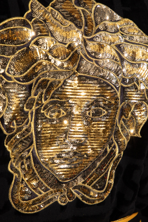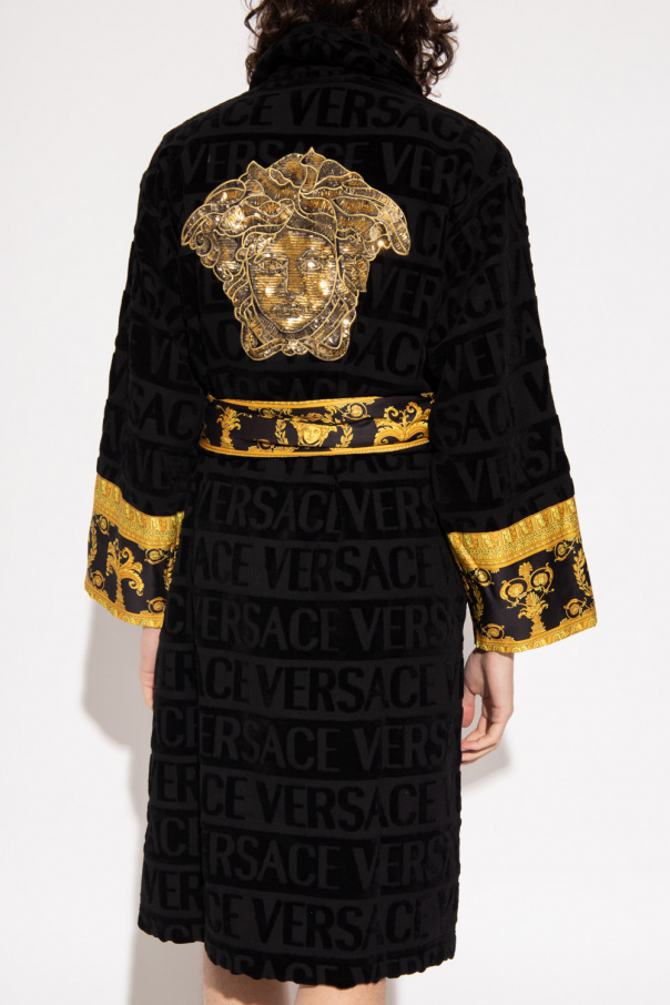Black bathrobe from Versace Home. Crafted from monogrammed terry cotton, this style showcases the brand's signature yellow and brown ‘Barocco’ pattern, Medusa embroidery encrusted with glistening sequins, a waist-cinching tie belt, two slip pockets and long sleeves.