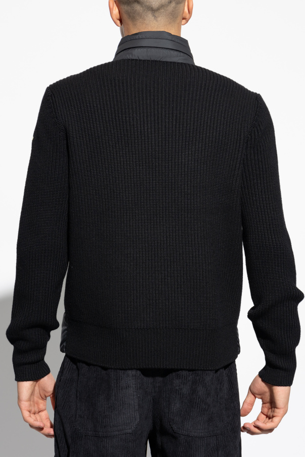 Introducing the Moncler Men's Cardigan ‘Tricot’ in black, a distinguished piece of attire that seamlessly melds timeless elegance with pragmatic functionality. Esteemed for its meticulous craftsmanship and superior design, this cardigan is perfect for the discerning gentleman. The front of the cardigan boasts a quilted, insulated panel reminiscent of a down jacket, providing unparalleled warmth. The sleeves and back are made from a thick, textured knit that exudes sophistication and comfort. Its dual-functionality zipper, featuring the iconic "Moncler" pull, extends from the hem to the top of the high neck collar, ensuring optimal thermal comfort. Long, textured knit sleeves ending in ribbed cuffs complement the high collar that snugly fits around the neck. The Moncler emblem on the left shoulder subtly underscores the piece’s exclusivity and authenticity. For convenience, two vertical side pockets offer practical storage while maintaining the garment’s sleek profile. Why choose this product? Luxurious blend of virgin wool and polyamide for exceptional warmth and durability. Quilted, down-filled front panel for added insulation. Signature Moncler details for a touch of exclusivity. Practical dual-function zipper and side pockets. High collar for enhanced comfort and warmth.