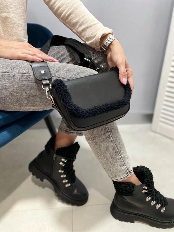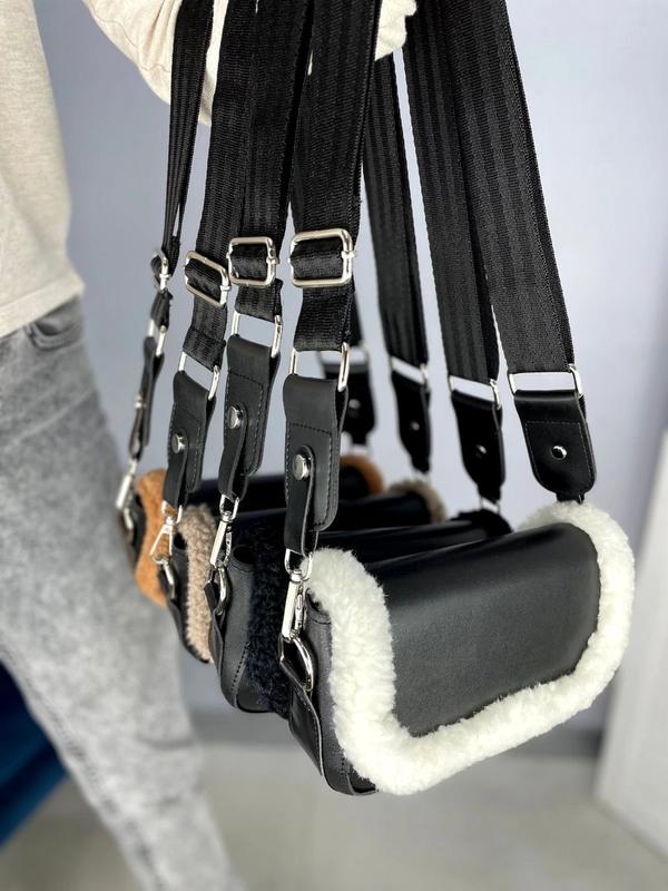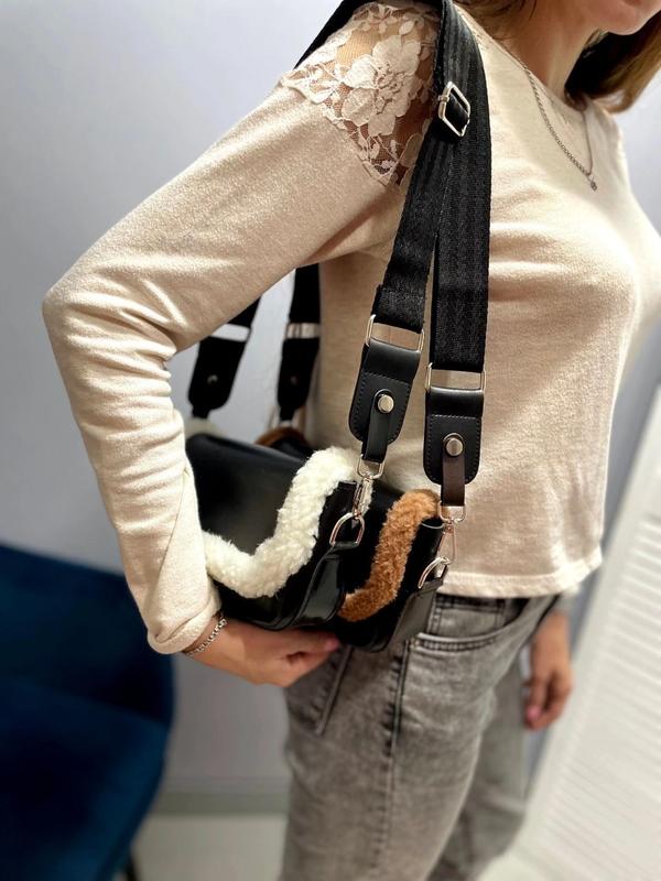 Особливість: Один основний відділ із кладкою на блискавці. Усередині є бічні кишені. Якісний підклад. Фурнітура люкс якості, срібного кольору. Висота – 13 см, ширина – 18 см, глибина – 6 см. Довжина ременя при максимальному збільшенні-115 см.Стан: НовийКолір:- Чорний