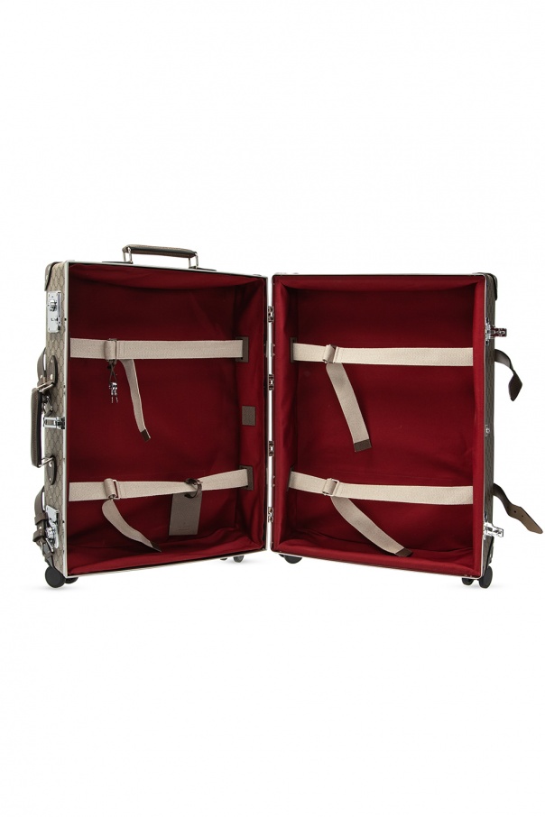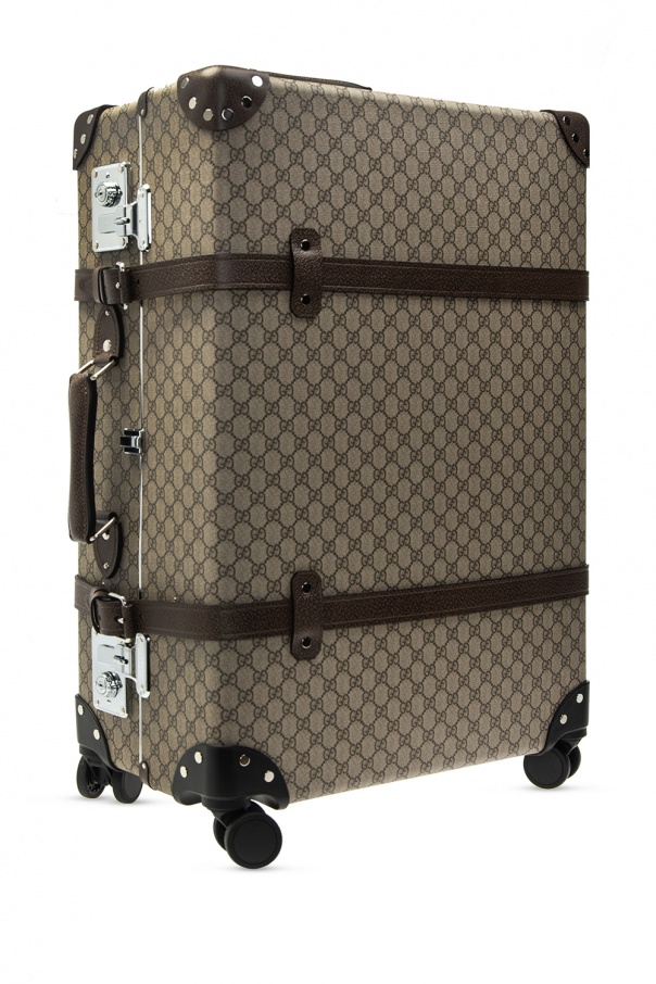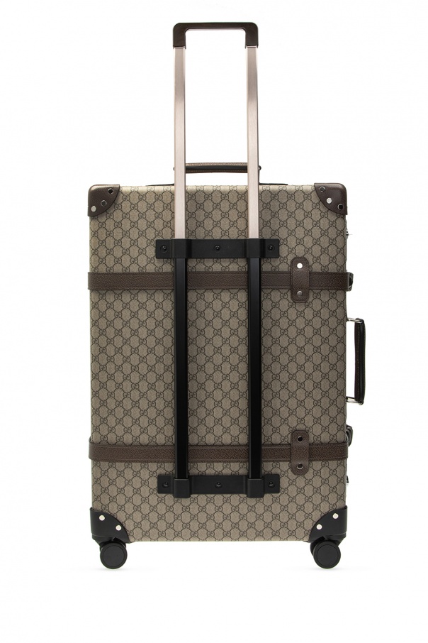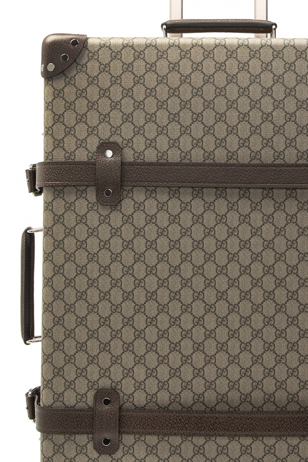 Beige suitcase from Gucci. Size large. Designed in GG Supreme canvas, this item features snap and strap fastenings, a GG logo print, two half-round handles (on top and bottom), a retractable handle, silver-tone metal hardware, four rotating wheels and one internal compartment.