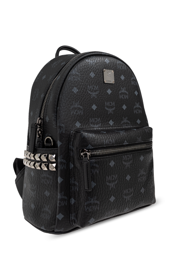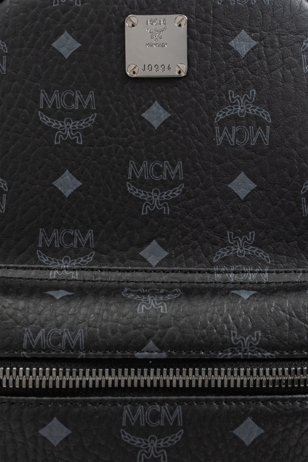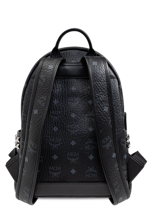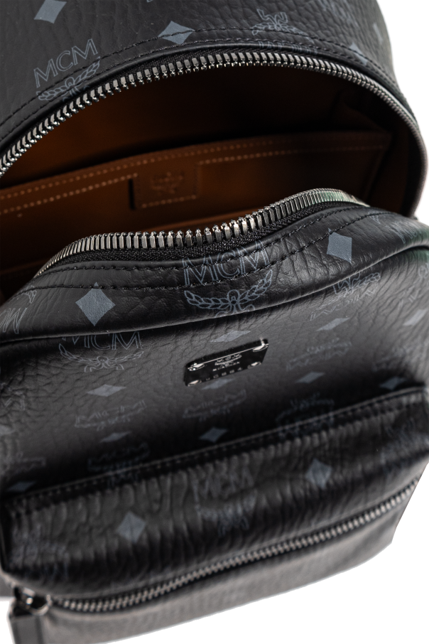 Black backpack from MCM. Crafted from textured canvas enriched with a printed logo pattern in grey, this item has a two-way zip fastening, front zip pocket, two side slip pockets, adjustable shoulder straps and one internal compartment with a slip pocket inside.