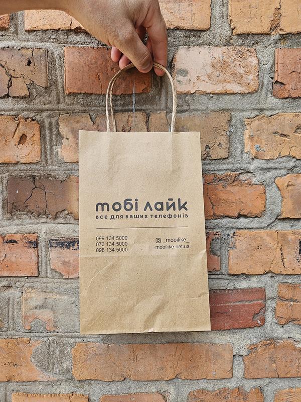 Пакет с ручками выполнен из крафт бумаги бурого цвета, плотностью 70 гр/м2 и