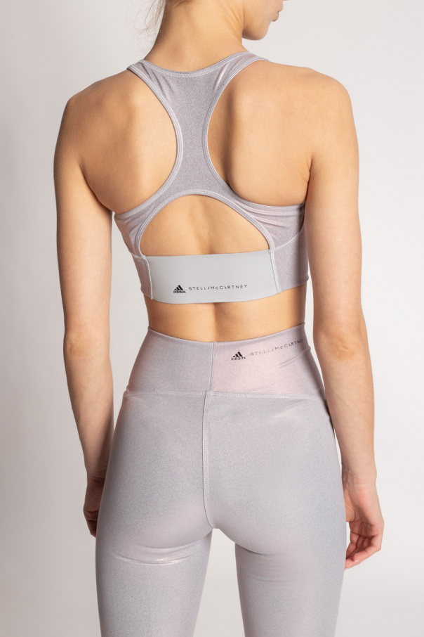 Grey and pink tank top from ADIDAS by Stella McCartney, the ‘Primegreen’ line. Crafted from moisture-absorbing AEROREADY fabric, this style showcases a black logo print, a cut-out back and glitter accents.