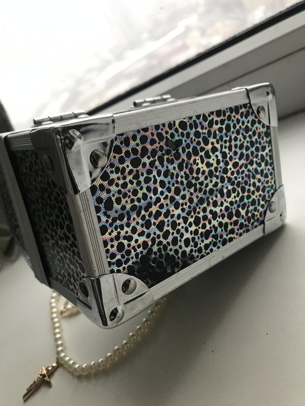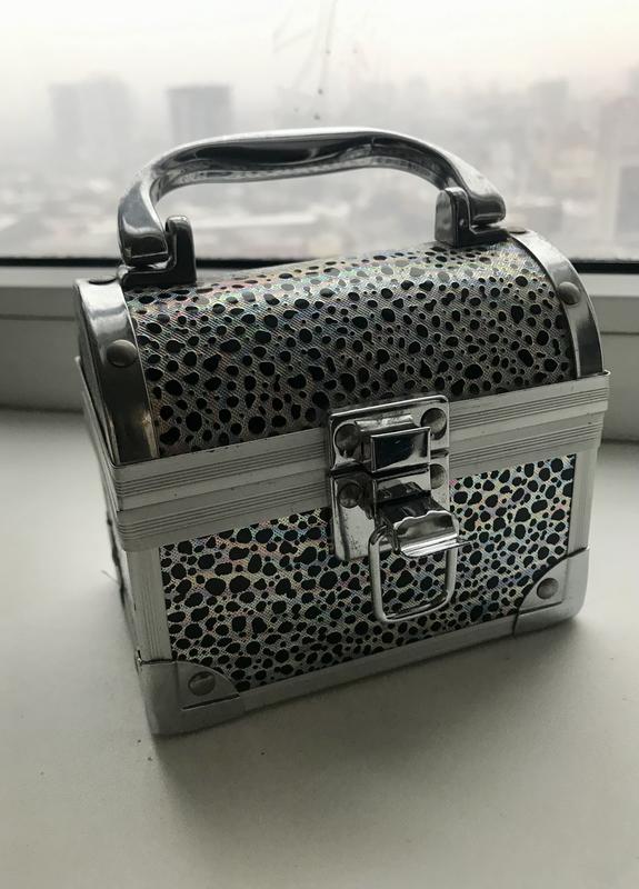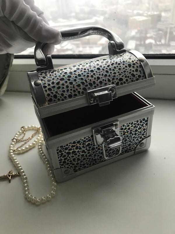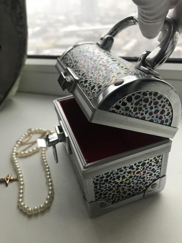 Шкатулка-сундучек для украшений. Сверху серебристое покрытие с виниловым эффектом, внутри отделана бордовым бархатом, есть зеркало.