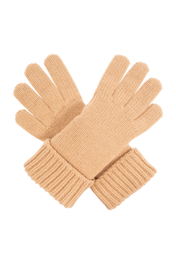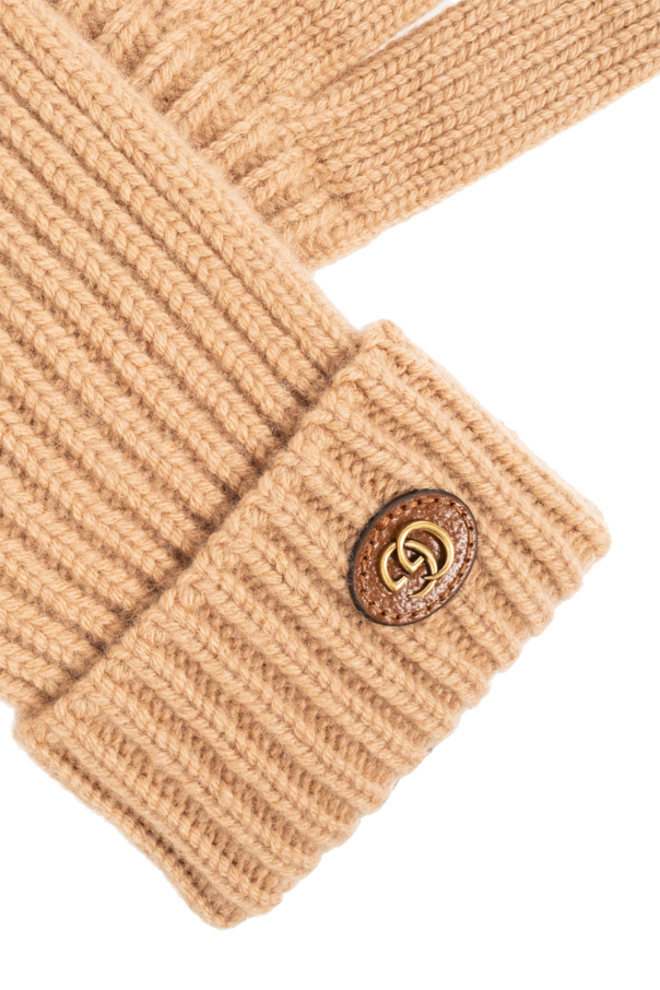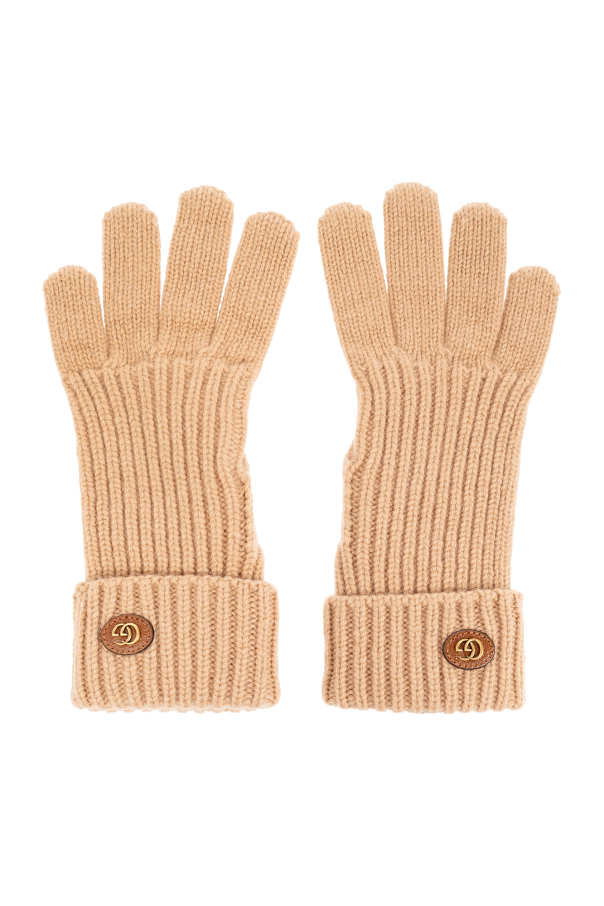 Light brown gloves from Gucci. Made of wool, this item features a leather patch with a metal logo in antique gold-tone.