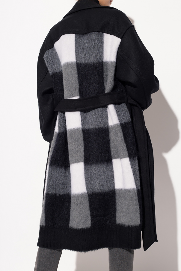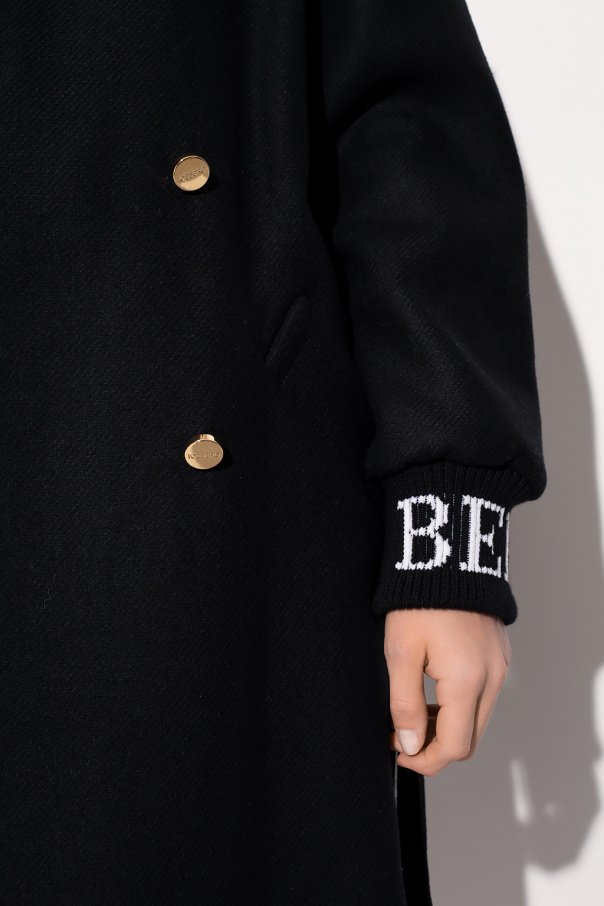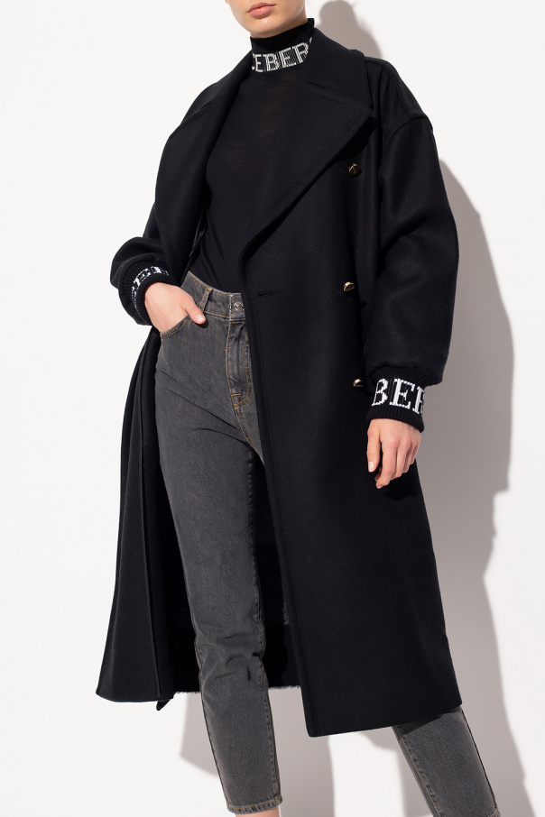 Black coat from Iceberg. Cut with a double-breasted silhouette, this style features gold-tone metal buttons with an embossed logo, grey-black-white checked panelling, peak lapels, white logo embroidery as well as two slip pockets and long sleeves with elasticated cuffs.