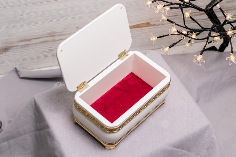 Изысканная деревянная шкатулка изготовлена из древесины ольхи, качественно покрашена в белый цвет и позолочена посредством нанесения потали (имитация сусального золота) на выделенные части изделия, затем вскрыта лаком в местах нанесения потали для большей практичности при использовании.
