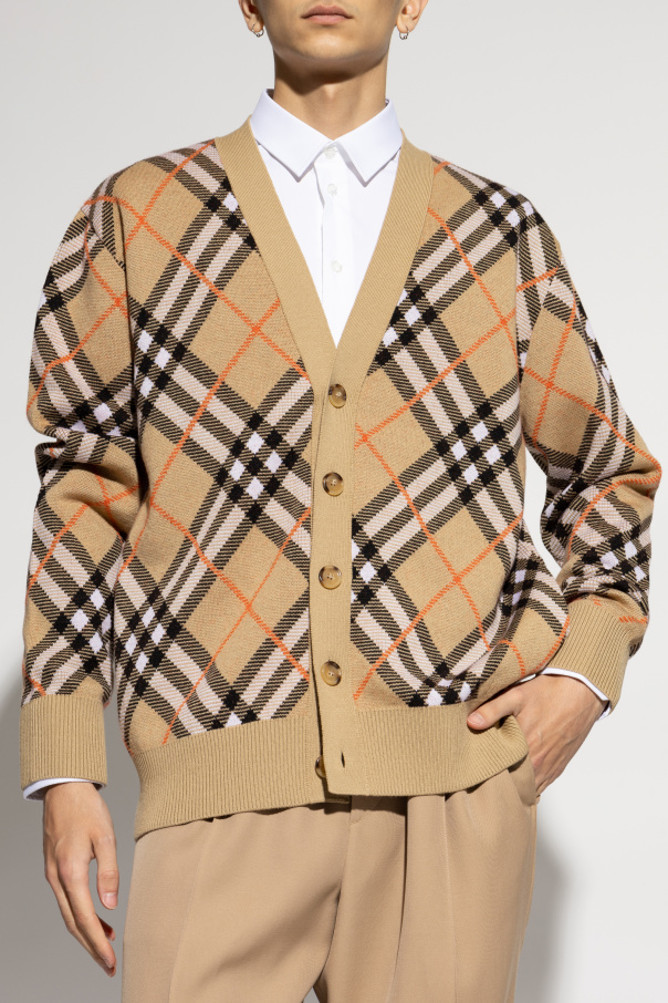 Introducing the quintessence of sophistication and timeless design, the Woolen Cardigan by Burberry. Crafted with an impeccable blend of materials including 87% wool, 7% mohair, 5% polyamide, and 1% elastane, this piece promises unparalleled warmth and a soft touch against the skin. Its distinguished beige hue serves as a canvas to the classical plaid pattern, intricately woven with black, white, and subtle orange accents, epitomizing the luxury inherent in Burberry's aesthetic. The cardigan's design features a classic V-neckline and long sleeves, complemented by ribbed hem, cuffs, and neckline to ensure a snug fit and shape retention. The front closure is adorned with large, round buttons, likely crafted from bone imitation or plastic, harmonizing with the cardigan's beige background. Notably, the absence of overt branding or logos foregrounds the brand's penchant for understatement, with only discreet identification marks that are a testament to its exclusive character. Moreover, this woolen cardigan is enhanced with practical details like two slip pockets, blending functionality with its elegant form. The traditional plaid pattern, a staple in exclusive fashion collections, together with its neutral and versatile color scheme, renders this garment a universal accessory, adaptable to both formal and casual ensembles. Why Purchase This Product? Exquisite Craftsmanship: A testament to Burberry's commitment to quality, made from a premium blend of wool and mohair. Timeless Design: The classic plaid pattern and neutral color palette ensure this cardigan remains a wardrobe staple for years to come. Versatility: Perfect for an array of occasions, effortlessly transitions from formal to casual settings. Functional Elegance: Equipped with two slip pockets, combining practicality with its sophisticated design.