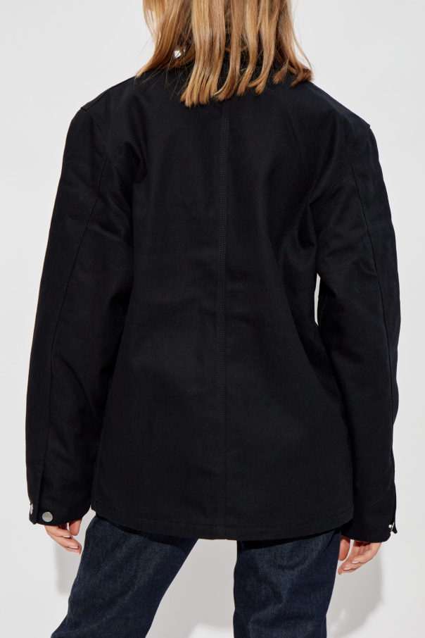 Introducing the Carhartt WIP Logo Jacket, a paragon of timeless elegance and robust craftsmanship. This exquisite black jacket epitomizes the essence of Carhartt's renowned durability and sophisticated design, tailored for the discerning urbanite. Fashioned from premium 100% cotton, this jacket boasts a pristine, monochromatic black hue. It features a classic, straight-cut silhouette with long sleeves, exuding a refined yet utilitarian charm. The solid, hard-wearing fabric is emblematic of Carhartt's legacy in workwear, ensuring longevity and resilience. The jacket is meticulously detailed with four pockets: two spacious lower pockets, a smaller chest pocket with a flap and button closure, and an additional open chest pocket, offering both functionality and style. The metal buttons enhance the jacket's robustness and add a touch of industrial chic. Adorned with the iconic Carhartt logo on the left chest—a white patch with an orange emblem and red "carhartt" inscription—this jacket is a testament to the brand's heritage. The dark collar, crafted from a velvety corduroy-like material, adds a luxurious finish. Why Buy This Product? Timeless Design: A classic cut with enduring appeal. Premium Material: Made from 100% cotton for ultimate comfort and durability. Functional Details: Four practical pockets for convenience. Iconic Branding: Features the distinguished Carhartt logo. Exceptional Craftsmanship: Solid construction with high-quality stitching.