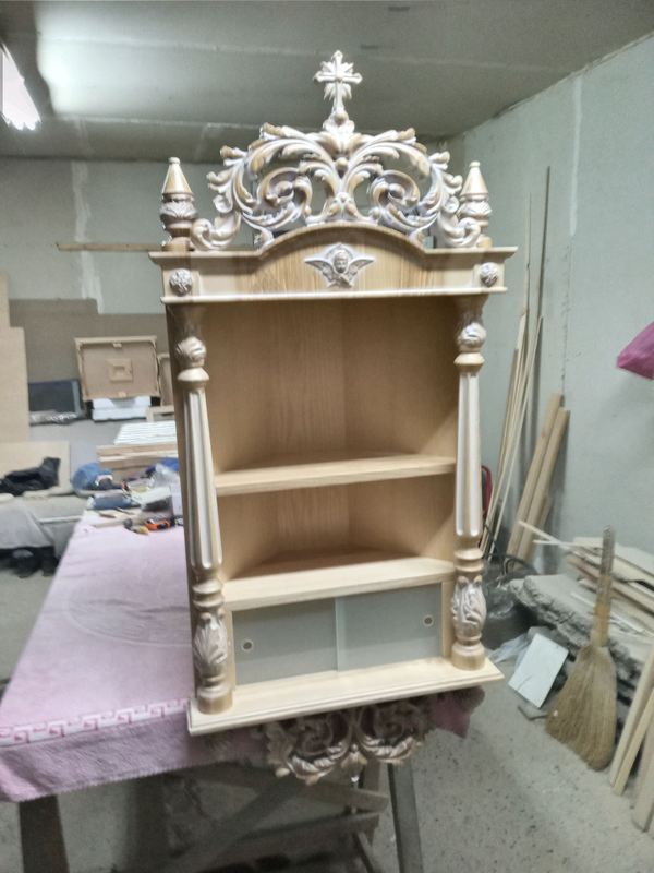 Домашній іконостас виготовлений з масиву ясена та шпонованої фанери. Покритий високоякісними лакофарбовими матеріалами. Розміри висота 123см,ширина 57см.