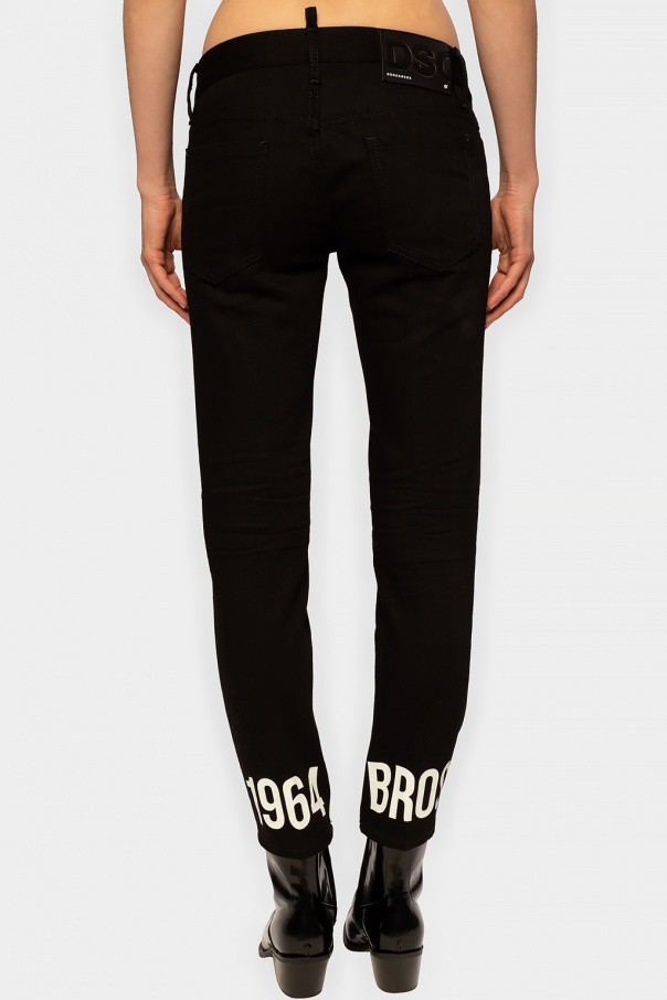 Black ‘Jennifer Cropped’ jeans from Dsquared2. Fastened with buttons. Decorated with a white logo print and patches. 3 slip pockets on the front, 2 at the back. Straight legs.