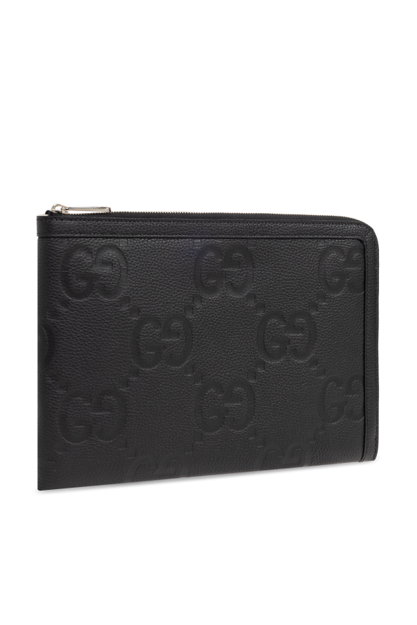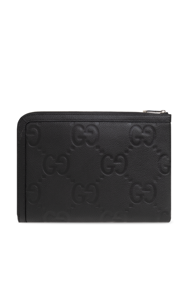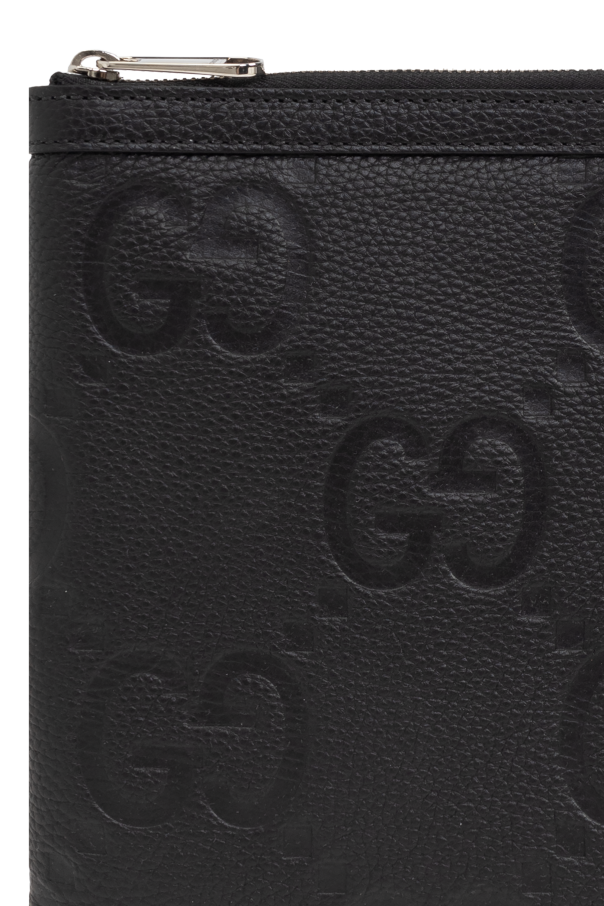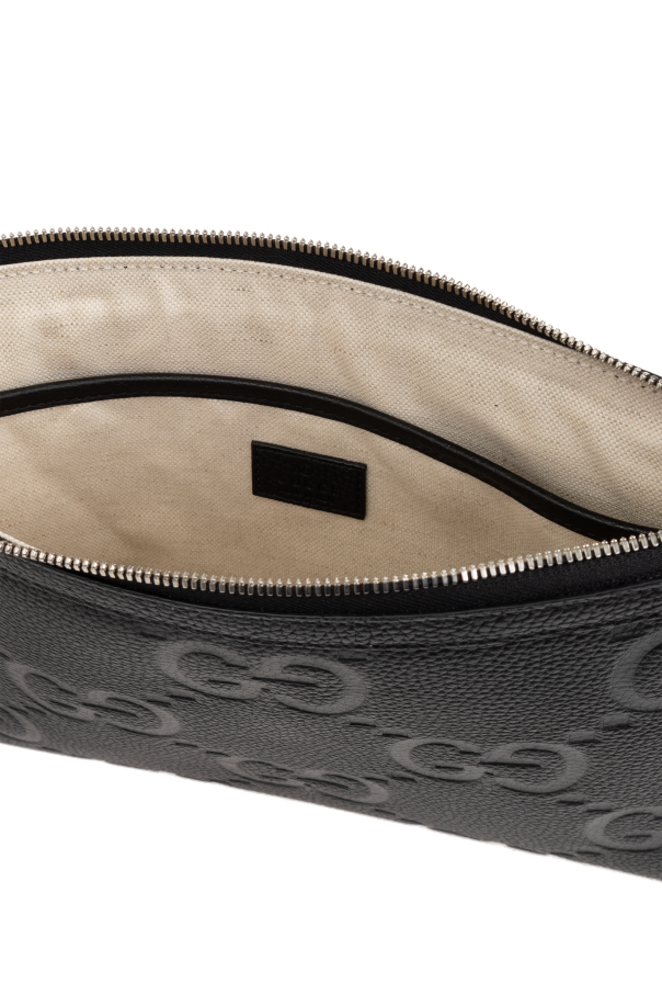 Introducing the "Jumbo GG Small" document bag, a testament to timeless elegance and functionality. Crafted with precision from 100% calf leather, this exquisite piece showcases a subtle yet striking monogram pattern made up of intertwined "G"s, a hallmark of sophistication that whispers luxury. Its black hue offers unmatched versatility, seamlessly blending with any ensemble or occasion. The bag's design is not just about aesthetics; it is also about practicality. Featuring a secure zipper closure at the top, it ensures the safety of your essentials within. The interior, lined with a cream, 100% cotton layer, includes a main compartment and a slip pocket, thoughtfully designed to organize your belongings efficiently. Metallic elements add a touch of understated glamour, enhancing the bag's exquisite appeal. Why Purchase This Product? Unparalleled craftsmanship from 100% calf leather and a 100% cotton interior. Elegant monogram pattern that exudes luxury without ostentation. Versatile black color that complements any attire. Functional design with a secure zipper closure and organized interior.
