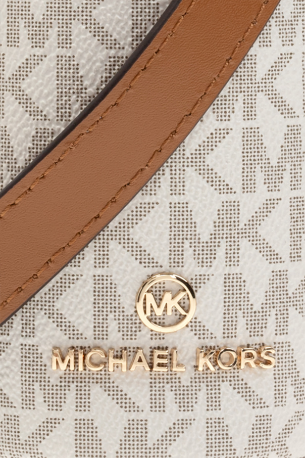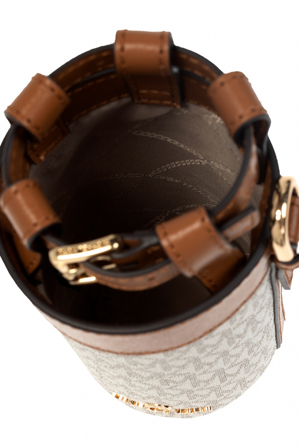White and brown bottle crossbody bag from Michael Michael Kors. Crafted from monogrammed canvas and leather, this item secures with a buckle strap and features gold-tone metal hardware, including a logo plaque, a detachable and adjustable shoulder strap and one internal compartment.