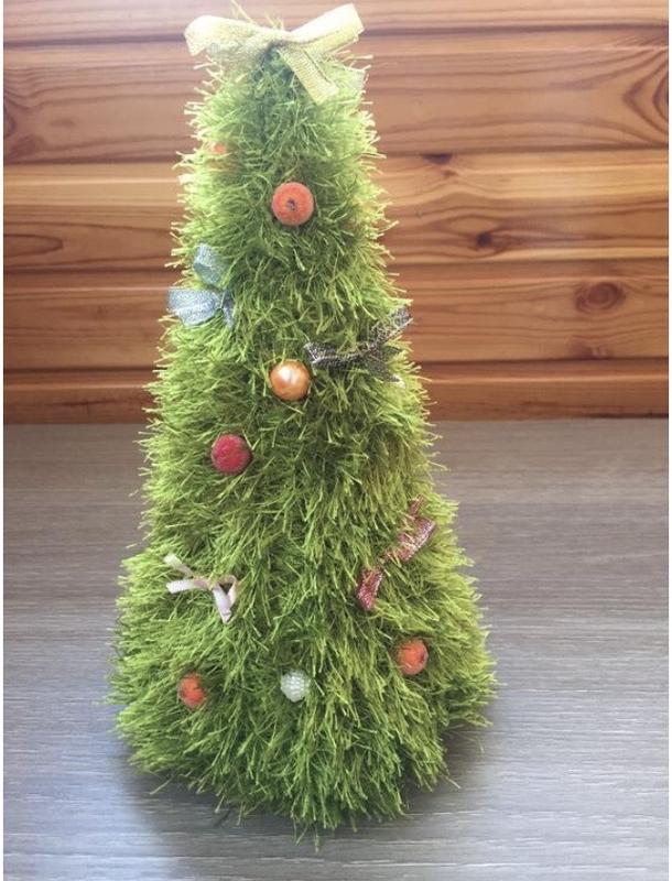 Елка высотой 24 смСвязана из фасонной пряжи, наполнена холлофайбером. Декорирована бусинами и лентами.