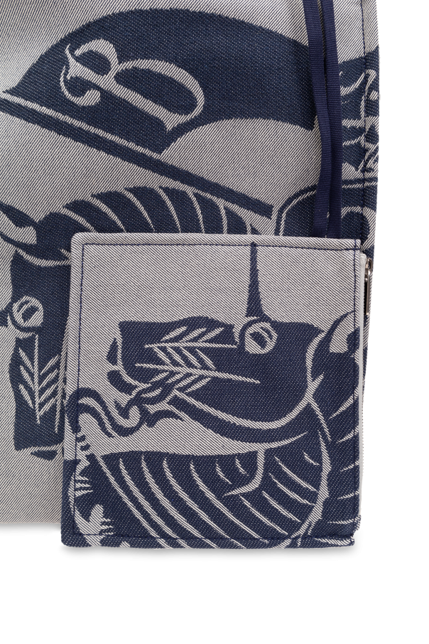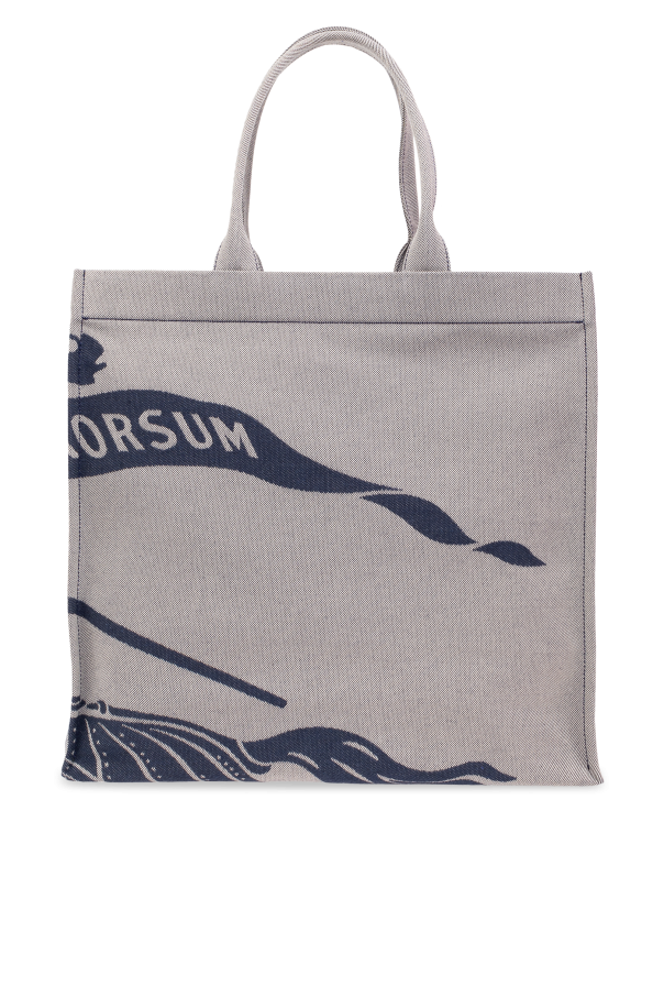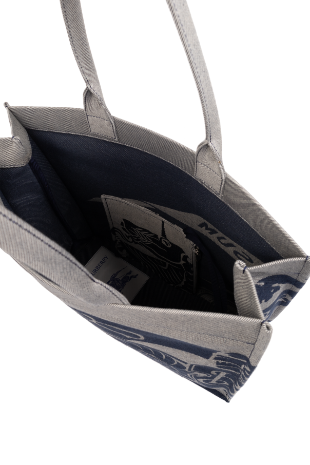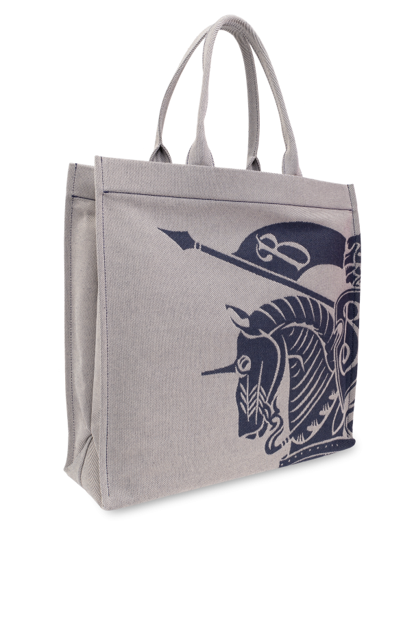 Introducing the Burberry Equestrian Knight Shopper Bag, a testament to timeless elegance and practical luxury. Crafted from a blend of 94% cotton and 6% polyester, this durable and sturdy gray shopper bag boasts a classic, simple shape with two equal handles, allowing for versatility in carrying, either by hand or over the shoulder. The front of the bag features a striking dark print depicting mythological or heraldic motifs – a knight on horseback with a lance – possibly linking to the brand's logo or a signature collection pattern. This detail not only captures attention but also identifies the piece with Burberry's unmistakable aesthetic. Additionally, the bag showcases an embroidered ‘Equestrian Knight’ design, further enhancing its unique appeal. Functionality meets sophistication in this spacious shopper, as evidenced by its ample interior, which includes a compartment and a zippered pocket strap for organized storage. An external flat pocket offers convenient access to small essentials, making this bag not only a stylish accessory but also a practical companion for daily use. Why invest in this product? Exquisite craftsmanship from a blend of high-quality materials. Iconic design with the Equestrian Knight print, distinguishing it as a Burberry classic. Ample storage space with internal and external pockets for enhanced functionality. Versatile carrying options for ultimate comfort and ease.