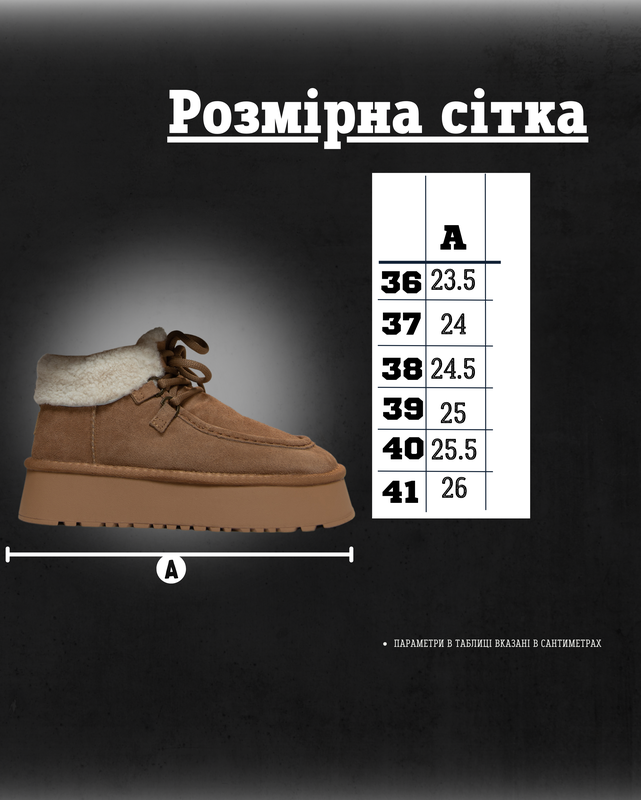 Матеріал верху:Замша ,Висота виробу:Середні ,Сезон:Зима , Осінь , Демісезон ,Матеріал підкладки:Хутро ,Тип підошви:Платформа ,Довжина устілки:25,5 см , 25 см , 24,5 см , 23 см , 23,5 см , 24 см , 26 см ,Опис