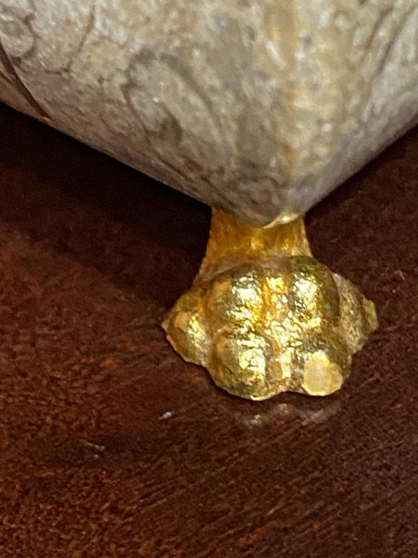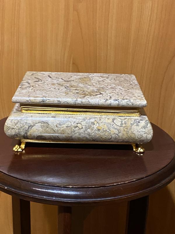 Шкатулка для безделушек из натурального камня яшмы. Украшена металлом желтого цвета на таких же ножках, которые напоминают лапу зверей. Открывается на рояльном навесе. Внутри бархат красного цвета. Сразу расскажу, что из недостатков можно назвать то, что на тот бархат прошел клей. ( последние фото). Это от производителя, мне такую подарили когда-то.