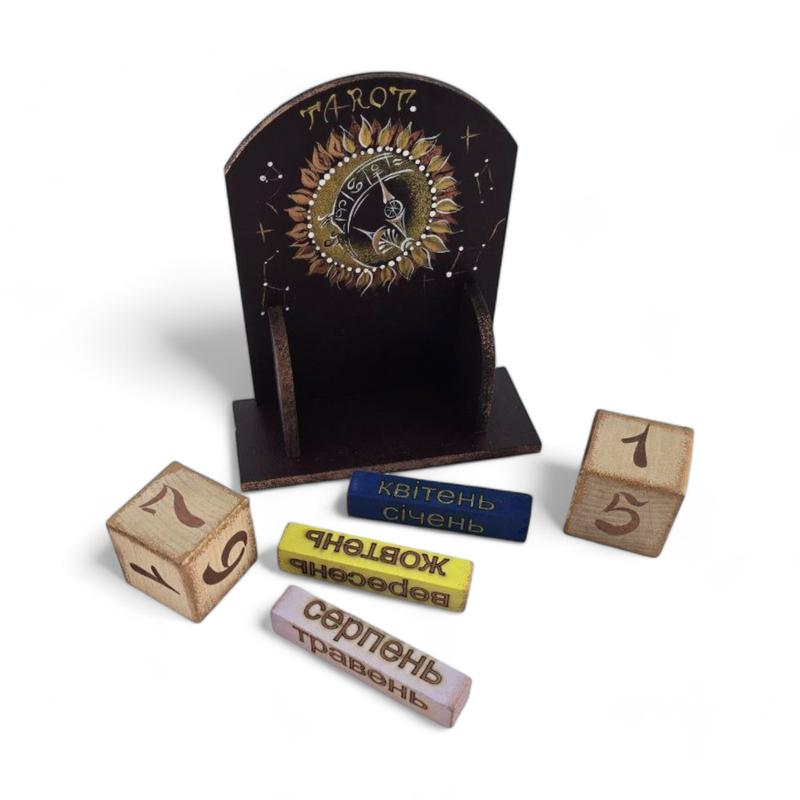 Этот уникальный вечный календарь изготовлен из дерева и воплощает в себе магию времени и символику Таро. Каждый кубик с числами месяца и названиями месяцев выполнен вручную с тщательным вниманием к деталям. На календаре размещены узоры, вдохновленные таинственными образами Таро, которые воплощают атмосферу загадочности и предвестия. Надпись "Таро" украшает верхнюю часть календаря, подчеркивая его связь с мистическим миром Таро.