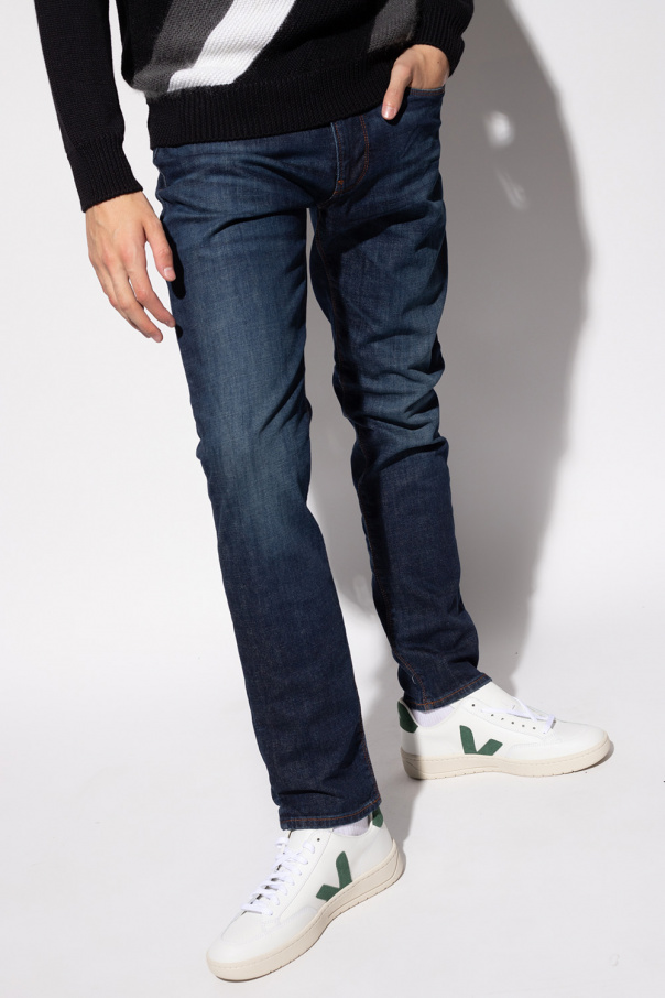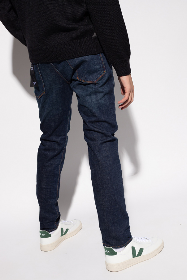 Navy blue jeans from Emporio Armani. Falling down with tapered legs, this pair features button fastenings, four slip pockets, distressed effects and a patch with a tactile logo in brown.