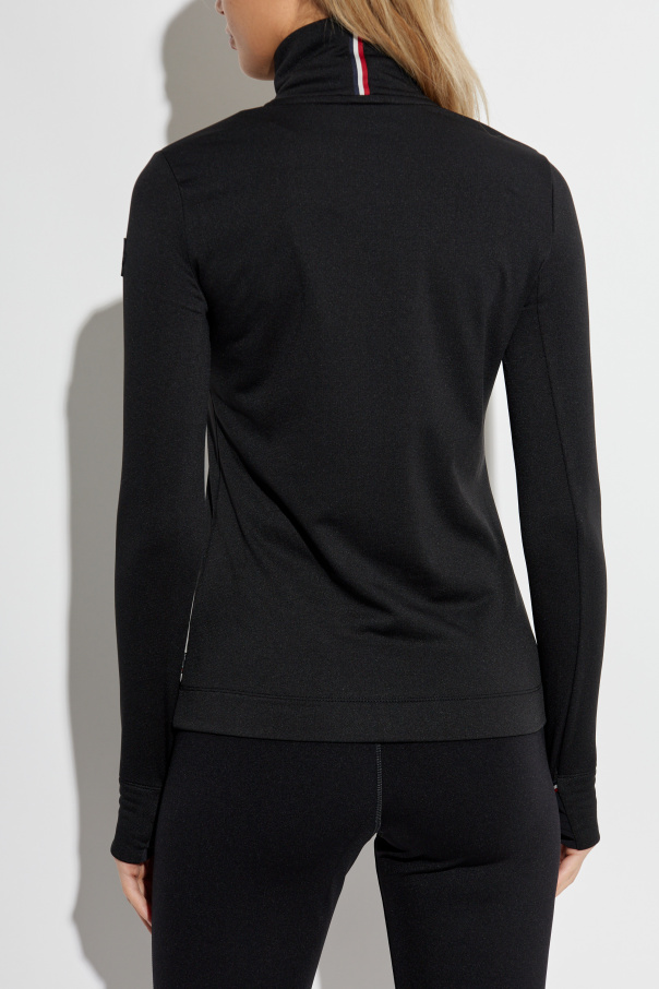 Introducing the Top with Stand-Up Collar by Moncler Grenoble, a hallmark of sophistication and functionality from our exclusive ski apparel collection. This top boasts an elegantly fitted silhouette with long sleeves, crafted to provide both style and superior performance on the slopes. The material, a premium blend of polyester and elastane, offers exceptional stretch and moisture-wicking properties, ensuring comfort and freedom of movement. The stand-up collar provides an added layer of warmth and protection against the winter chill. Distinctive details include small, tricolor inserts at the sleeve hems and a tricolor stripe adorning the back of the collar—signature marks of the Moncler brand. A black logo on the left sleeve further accentuates the top's exclusive appeal. Dominated by a sleek black color, this top can be effortlessly paired with various ensembles. As showcased, it pairs impeccably with a beige puffer jacket, black leggings, and black boots, highlighting its versatility and stylish potential. Why Choose This Product? High-quality materials ensure durability and comfort. Elegant and functional design suitable for winter sports. Exclusive Moncler Grenoble detailing adds a luxurious touch. Versatile black color allows for easy coordination with other pieces. Iconic brand reputation in the world of high fashion and sportswear.