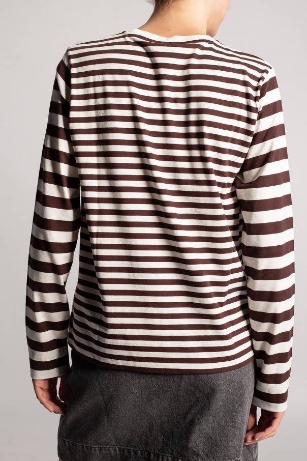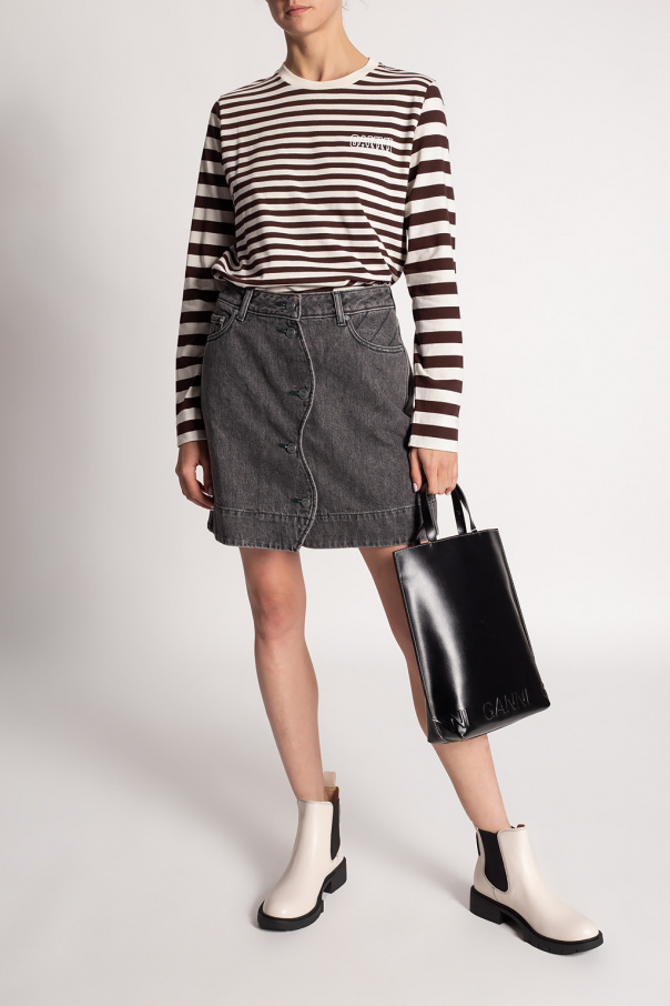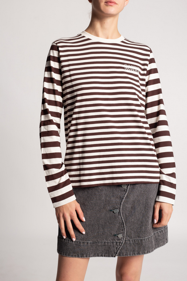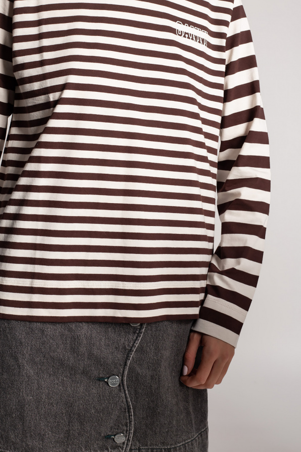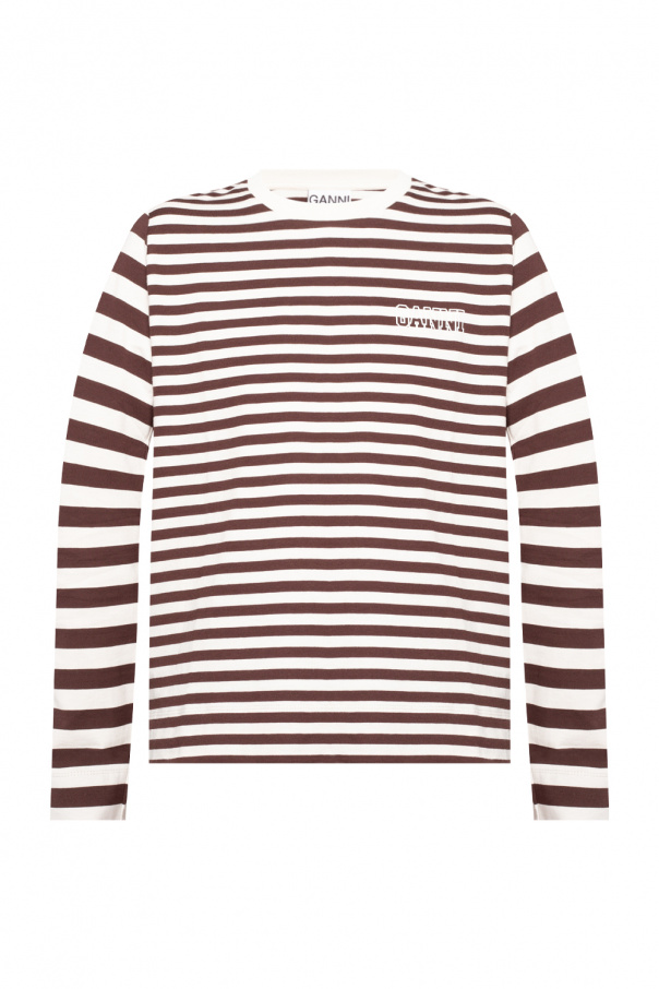 Dark brown and white T-shirt from Ganni. Crafted from organic cotton, this long sleeve design features a stripe pattern, white logo print and ribbed round neck.