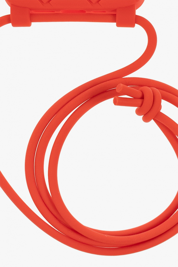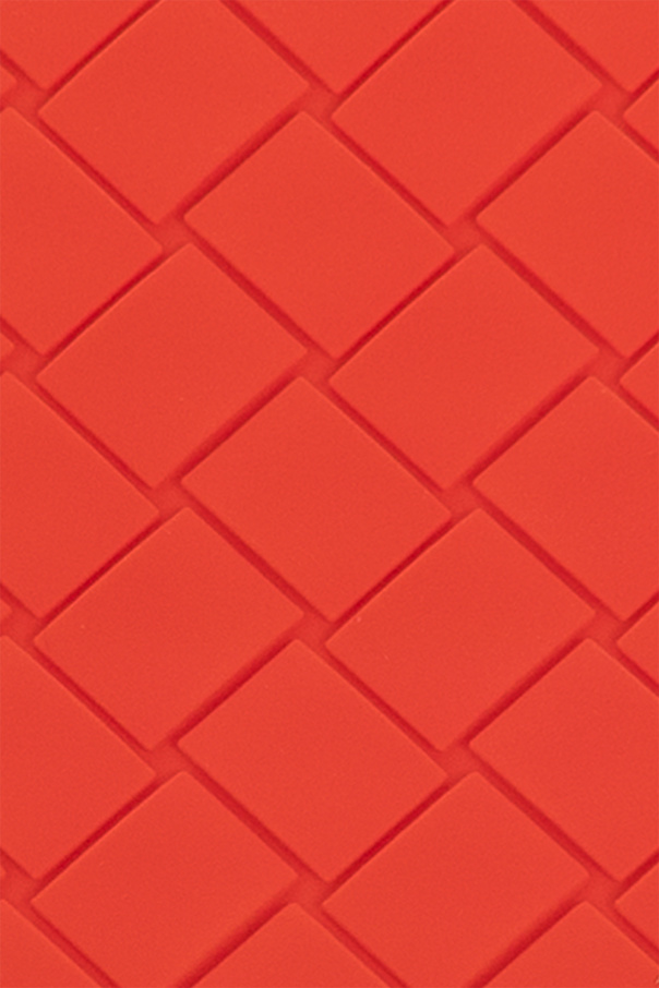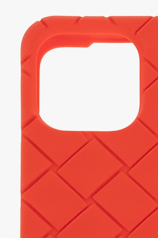 Light red iPhone 13 Pro case with a strap from Bottega Veneta. Made of silicone, this item showcases the brand’s signature Intrecciato weave.