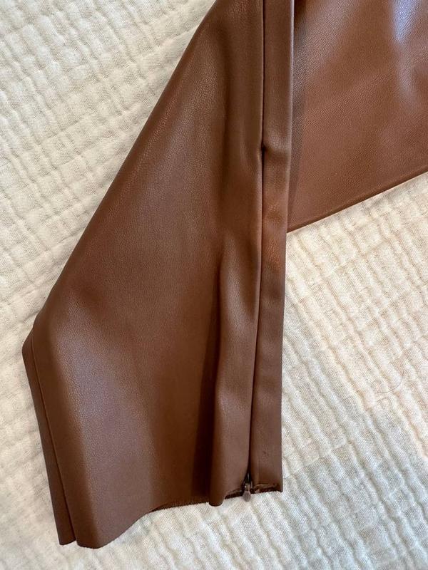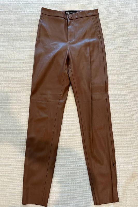 Кожаные коричневые скинни ZARA, внизу на внешней стороне замочки, внутри ткань напоминает замшу, подойдут на холодную погоду, в идеальном состоянии, без дефектов. Размер хс, очень хорошо тянутся. Замеры: длина - 95 см, талия - 31, бедра 42.