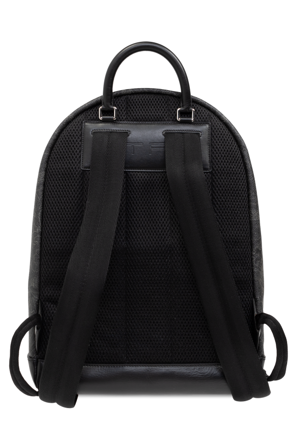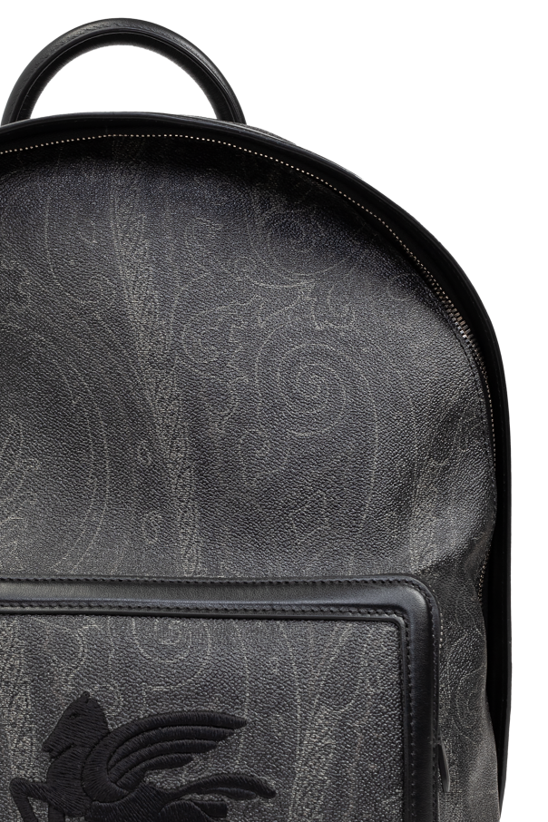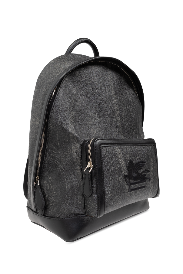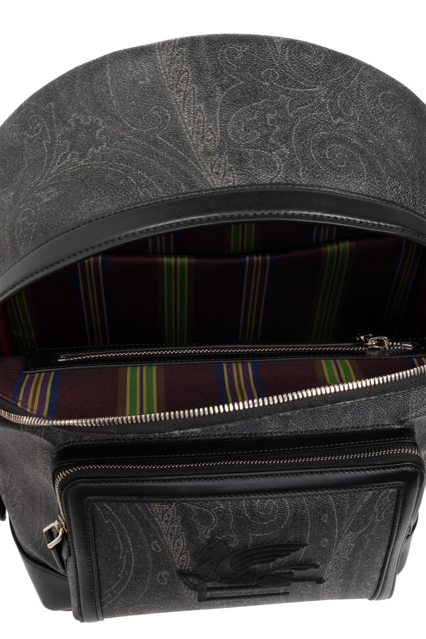 Introducing the Etro Designer Backpack, a paragon of sophistication and utility. Crafted with an exquisite blend of high-quality leather and durable canvas, this backpack is designed to accompany the discerning individual through their daily endeavors. The dominant black hue, accented with a subtle, lighter pattern reminiscent of paisley, evokes an air of refined elegance. The backpack features a distinctive logo, depicting a swan set against a square frame, which rests on the front pocket, adding a touch of exclusivity to its design. The main compartment and an additional front pocket, both secured with dual-directional zippers, offer ample space for personal belongings. The interior is meticulously lined with contrasting fabric, featuring additional zippered and slip pockets for organized storage. Adjustable shoulder straps, crafted from a mesh-like material with leather accents, ensure comfort and durability. A robust handle at the top allows for versatile carrying options. Precision stitching and impeccable finishing are testament to the backpack's superior craftsmanship. Why Invest in This Product? Exclusive Etro design, blending elegance with functionality. Luxurious materials, including high-quality leather and durable canvas. Organizational efficiency with multiple compartments and pockets. Adjustable, comfort-designed shoulder straps and a strong carrying handle. Subtle yet sophisticated pattern and design details.