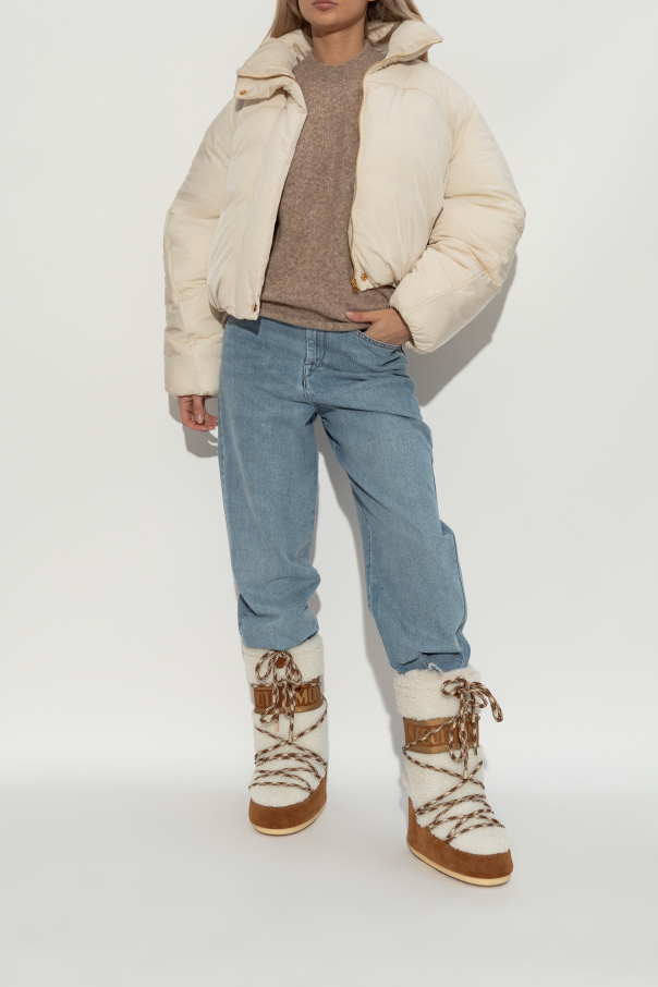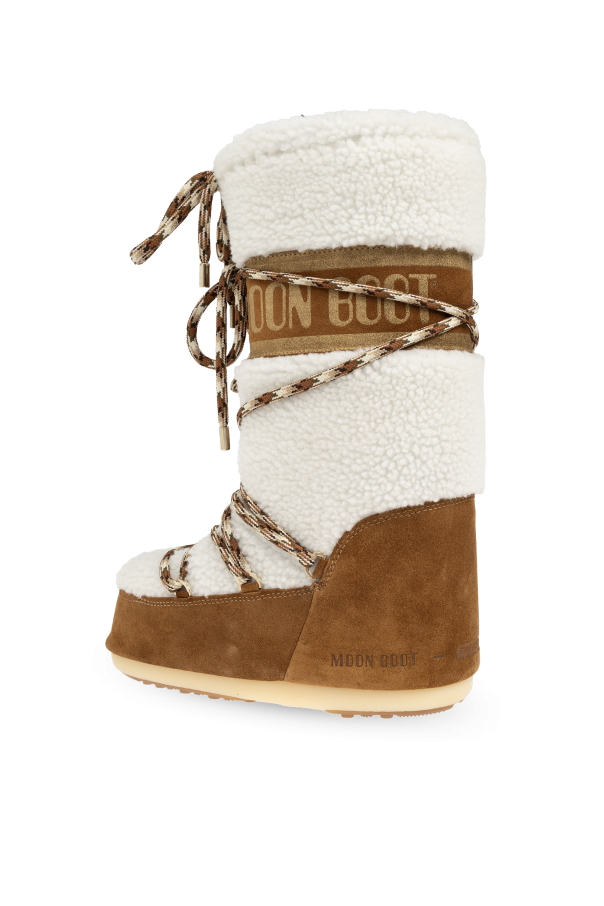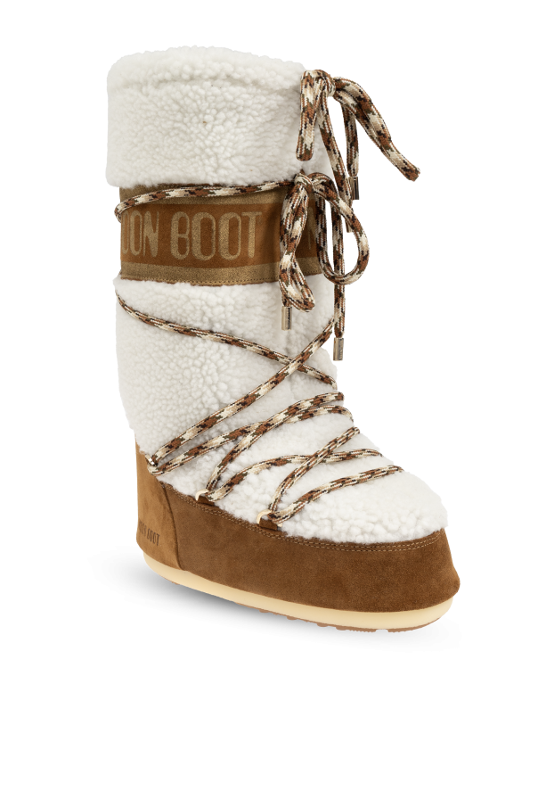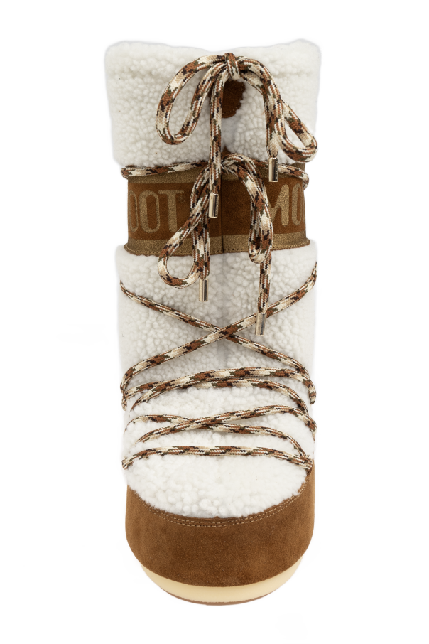 Introducing the exquisite Icon Shearling Snow Boots by the renowned brand Moon Boot, an epitome of luxurious winter fashion. From their exclusive collection, these boots are a perfect blend of elegance and practicality. The Icon Shearling Snow Boots boast a classic high-top design with a wide, sturdy base, ensuring stability and comfort in winter conditions. The upper layer is crafted from plush white shearling, imparting a soft and cozy appearance, while the lower section and straps, made from rich brown suede, add a touch of sophistication and contrast. The multicolored woven laces not only provide a stylish accent but also allow for an adjustable fit. Distinctive details include a broad brown strap at the top emblazoned with the "MOON BOOT" logo and embossed branding on the sides, emphasizing the boots' heritage. The profiled rubber sole ensures superior grip on slippery surfaces, making these boots as functional as they are fashionable. Why Choose This Product? High-quality materials: Suede and shearling exterior with a rubber sole. Elegant design: Classic high-top with a sophisticated color contrast. Brand prestige: Iconic "MOON BOOT" logo and embossed branding. Excellent traction: Profiled sole for better grip on icy surfaces. Adjustable fit: Multicolored woven laces for a customized fit.