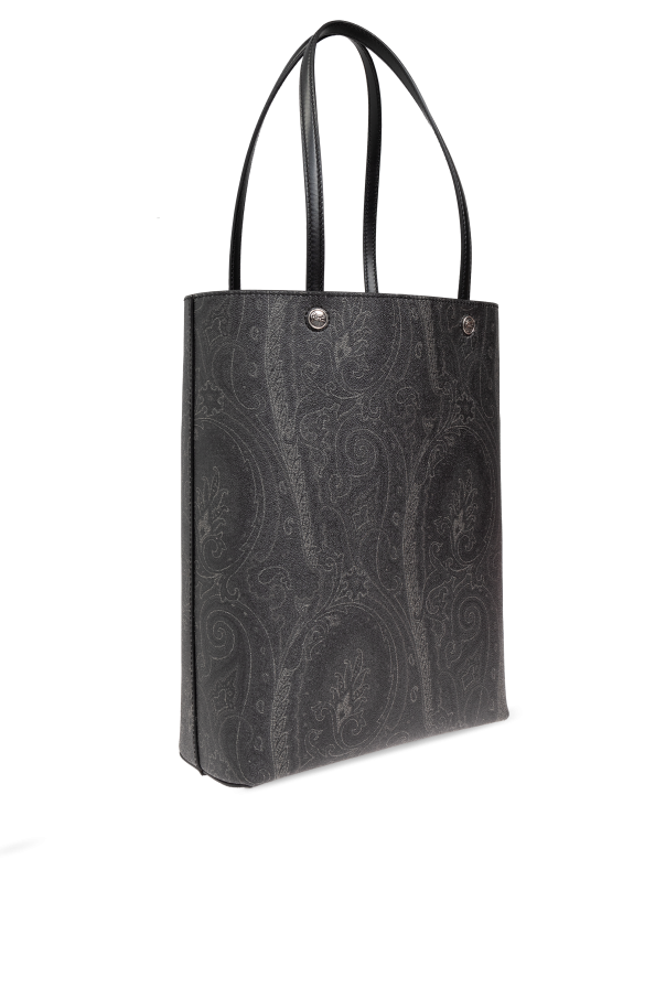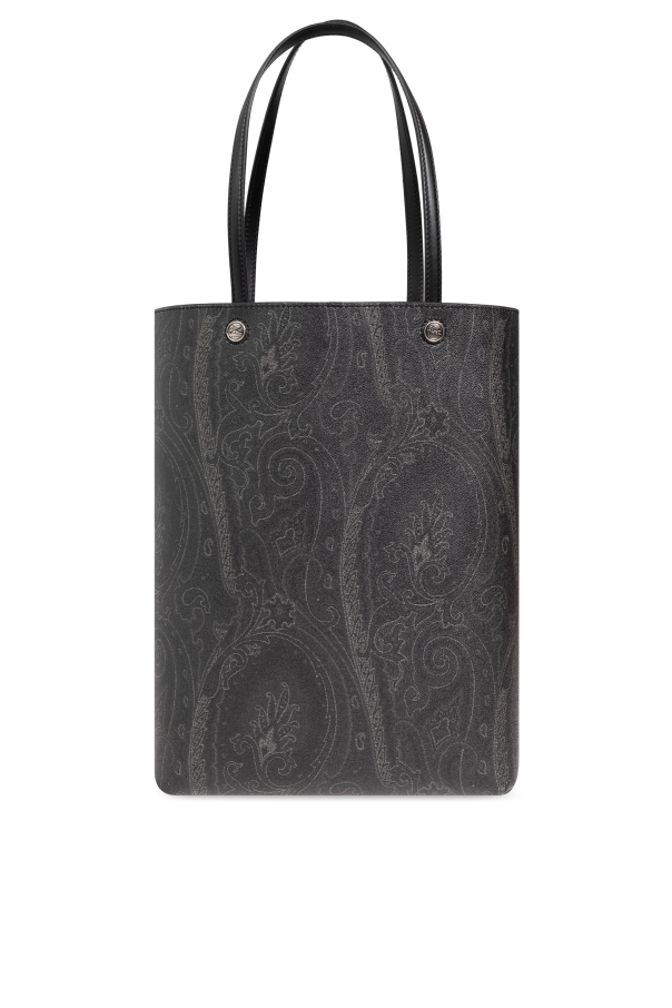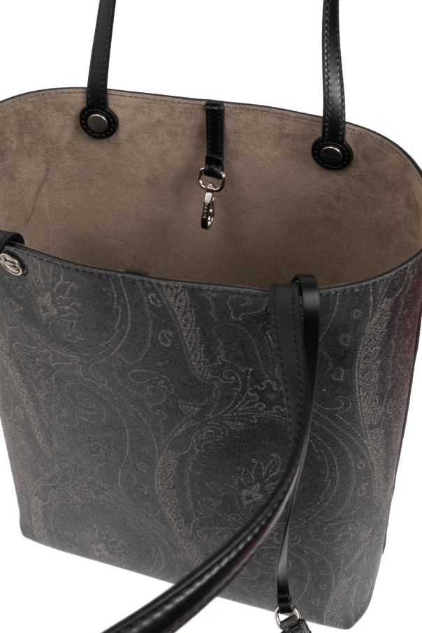 Introducing the Etro Shopper Bag, a paragon of sophistication from the illustrious Italian fashion house, Etro. Founded in 1968 by Gerolamo Gimmo Etro, this renowned brand masterfully combines Italian craftsmanship with the intricate beauty of Asian design, as exemplified by their signature paisley pattern. Crafted from high-quality leather and canvas on the exterior, this rectangular shopper bag boasts an exquisite paisley motif in a refined gray hue. The two sturdy handles allow for versatile carrying, whether on the shoulder or by hand. The interior, lined with a contrasting, suede-like material, features a practical zippered pocket for added convenience. The bag is adorned with metal buttons securing the handles, each embossed with the designer's logo, adding a touch of opulence. A strap with a carabiner ensures partial security, while the additional detachable pouch with a zipper closure offers further functional elegance. Why Choose This Product? Elegant Design: Subtle paisley pattern exudes timeless sophistication. High-Quality Materials: Premium leather, canvas, and metal accents ensure durability and luxury. Functional Features: Includes a zippered inner pocket and a detachable pouch for organized storage. Versatile Carrying: Dual handles for shoulder or hand carry. Exclusive Brand: Designed by the prestigious Etro, a symbol of Italian elegance.
