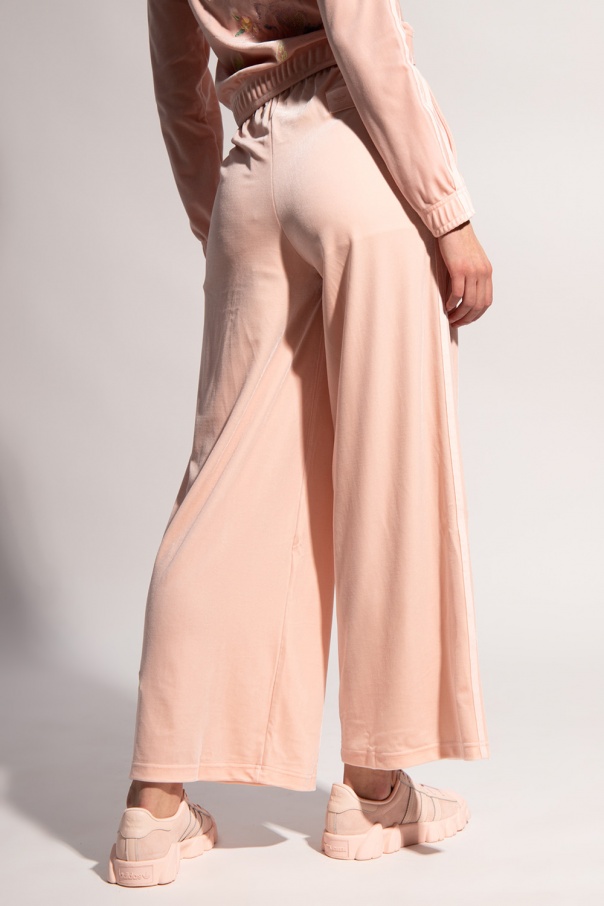 Light pink track pants from ADIDAS Originals x Angel Chen. Crafted in velour, this pair is cinched with drawstring at the waist and it features the brand's logo embroidered with silver-tone lurex thread, Adidas' iconic three stripes on the sides, two pockets with concealed zip closures and flared legs.
