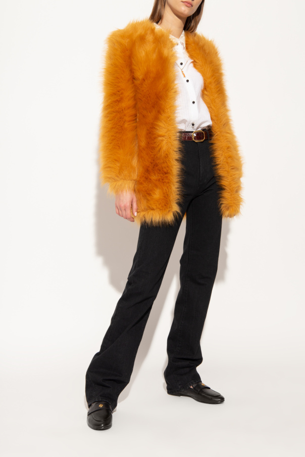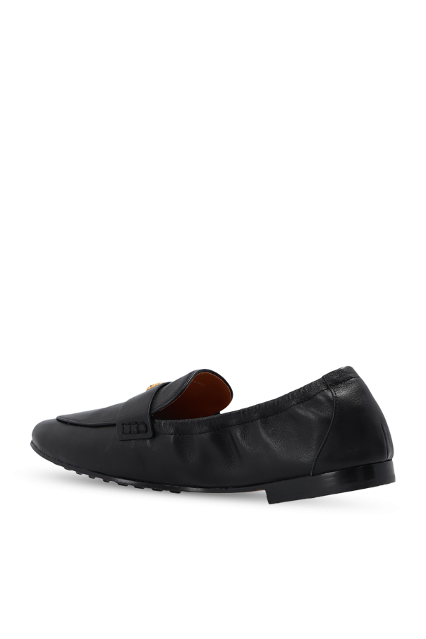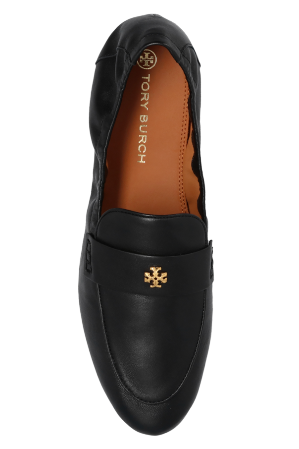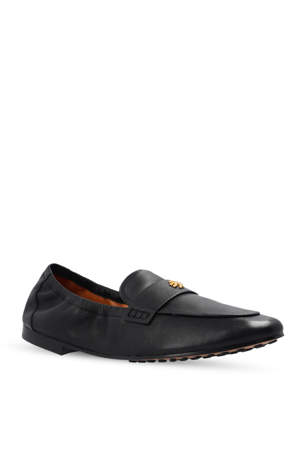 Black loafers from Tory Burch. Made of leather, this pair is complete with a gold-tone logo appliqué and brown sole made of leather and rubber.